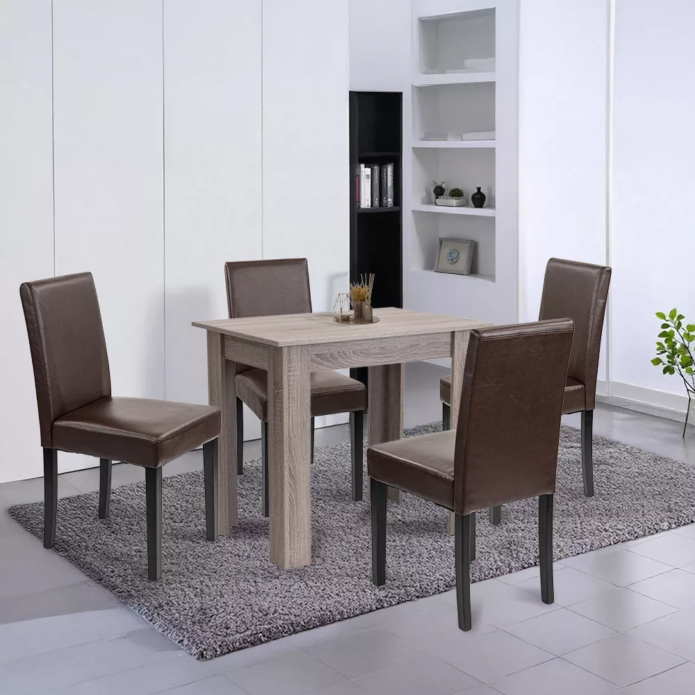 Zestaw zawiera cztery krzesła Leziter Kelly, które są nie tylko stylowe dzięki brązowej tapicerce ze skóry ECO, ale także niezwykle łatwe w czyszczeniu. Gruba piankowa powierzchnia siedziska o grubości 4 cm zapewnia komfort nawet podczas długich kolacji, a solidne sosnowe nogi o nośności 120 kg pozostają niezawodnymi towarzyszami nawet podczas intensywnego użytkowania.