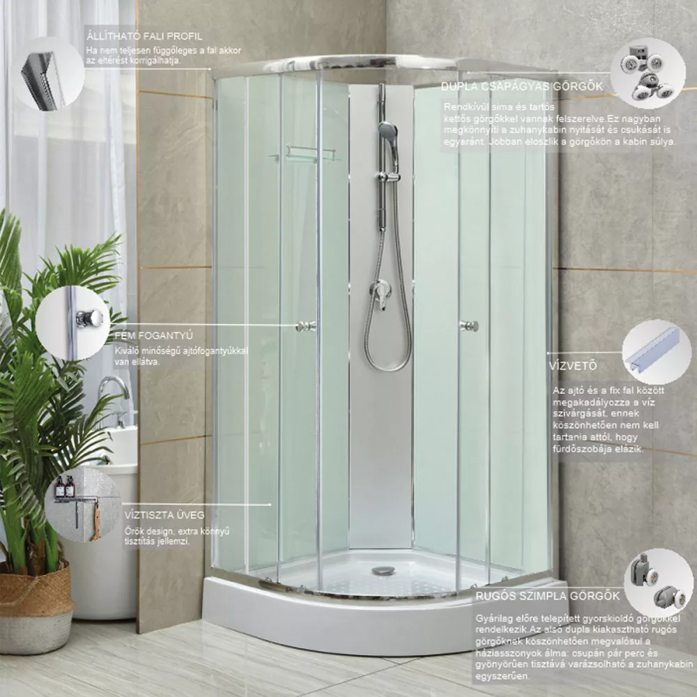 Ez lehetővé teszi az apróbb fal-egyenetlenségek korrigálását. Például egy 90×90 cm-es kabin tényleges beépítési mérete lehet 88–90 cm.