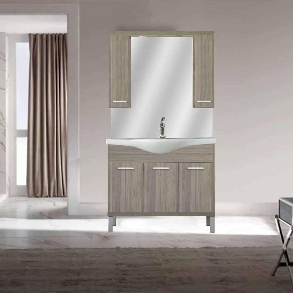 Lustrzana szafka zajmuje niewiele miejsca, ale ma dwa otwory do przechowywania , w których można wygodnie przechowywać przybory toaletowe. Ze względu na niewielkie wymagania przestrzennenadaje się również do mniejszych łazienek, na przykład w mieszkaniach z prefabrykatów. Produkt wykonany jest z wysokiej jakości płyty meblowej i dostarczany z dopasowanymi kolorystycznie zamkami krawędziowymi. Meble łazienkowe dostępne są w wersji podwieszanej.
