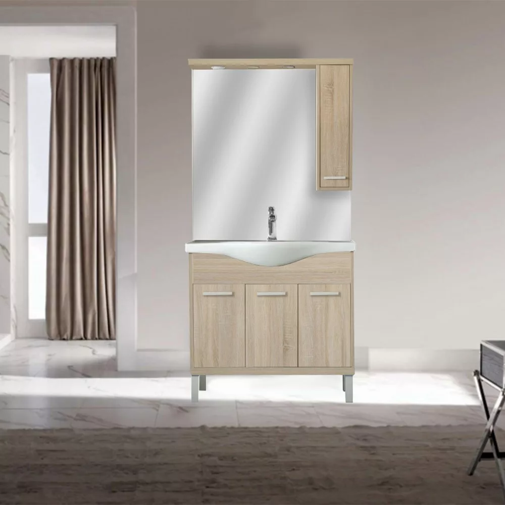 Szafka z lustrem zajmuje niewiele miejsca, ale posiada schowek , w którym można wygodnie przechowywać przybory toaletowe. Dzięki niewielkim rozmiaromnadaje się również do mniejszych łazienek, na przykład w mieszkaniach z prefabrykatów. Produkt wykonany jest z wysokiej jakości płyty meblowej i dostarczany z dopasowanymi kolorystycznie zamkami krawędziowymi. Meble łazienkowe są dostępne w wersji podwieszanej.
