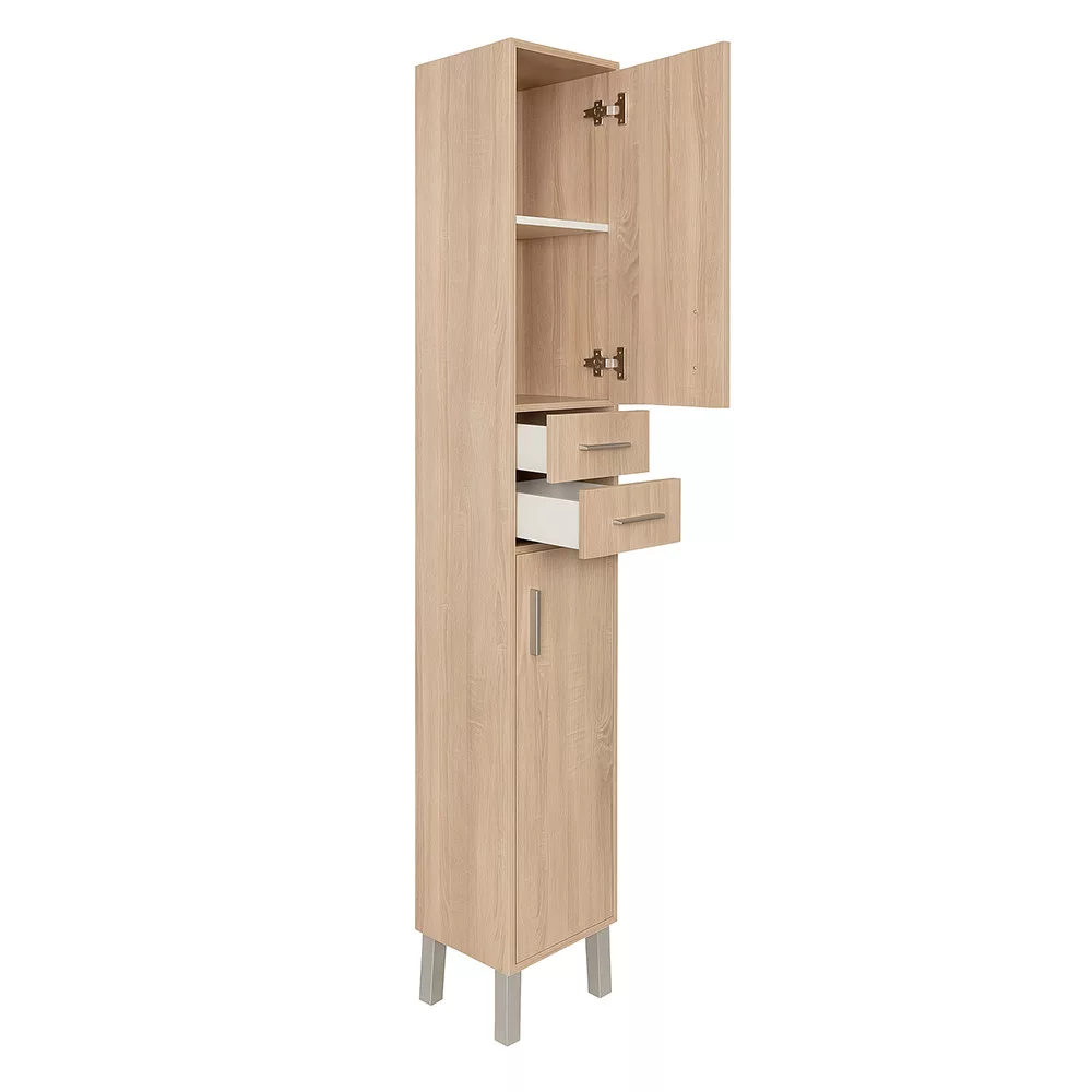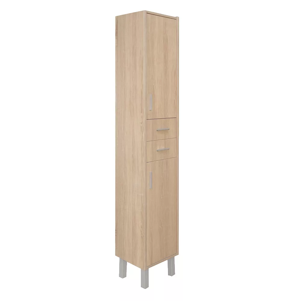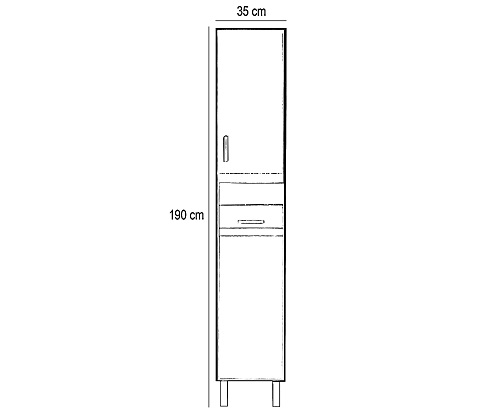 Mebel łazienkowy zajmuje niewiele miejsca, ale posiada dwie jednodrzwiowe szafki i dwie pojemne szuflady, w których można wygodnie przechowywać kosmetyki łazienkowe. Dzięki niewielkim rozmiaromnadaje się również do mniejszych łazienek, na przykład w mieszkaniach z prefabrykatów. Produkt wykonano z wysokiej jakości płyty meblowej i wyposażono w dopasowane kolorystycznie zamki krawędziowe. Meble łazienkowe dostępne są w wersji stojącej.