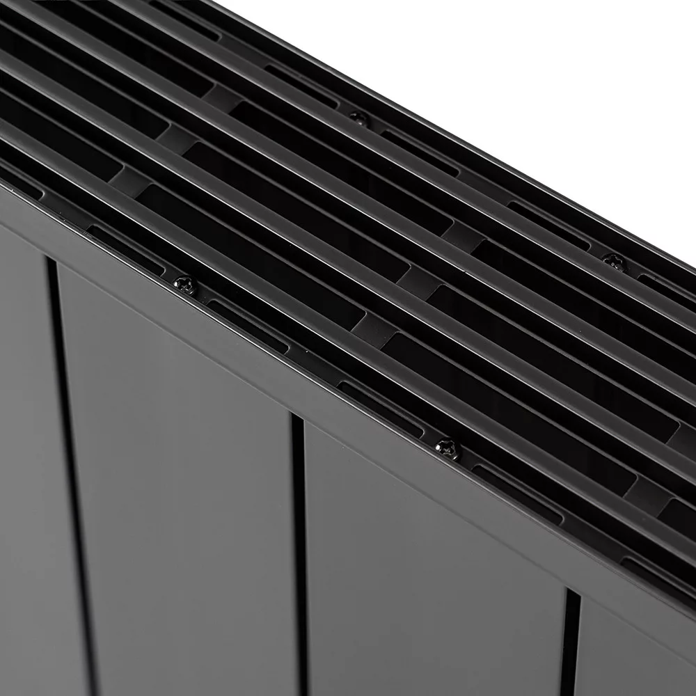 Obudowa grzejnika wykonana jest z aluminium, materiału, który jest zarówno trwały, jak i odporny na rdzę, a także doskonale przewodzi ciepło. Pionowe żeberka optycznie wysmuklają powierzchnię, a stonowany czarny kolor doskonale komponuje się z niemal każdym stylem wnętrza, od nowoczesnego minimalizmu po klasyczne wnętrza.