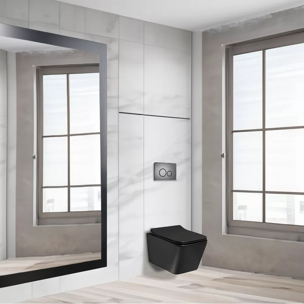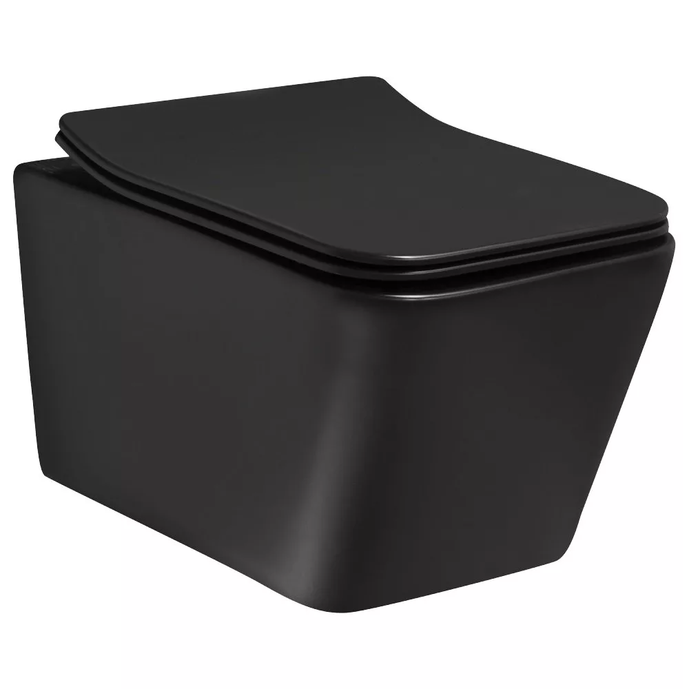 Częścią zestawu jest toaleta Tinos BLM z kowadełkiem z funkcją cichego domykania. Oznacza to, że deska sedesowa zamyka się powoli i cicho, nie zatrzaskując się nagle. Funkcja ta zapewnia komfort i ciszę, a także dłuższą żywotność deski. Toaleta Tinos jest wykonana z czarnej ceramiki, która jest łatwa w czyszczeniu i higieniczna.
