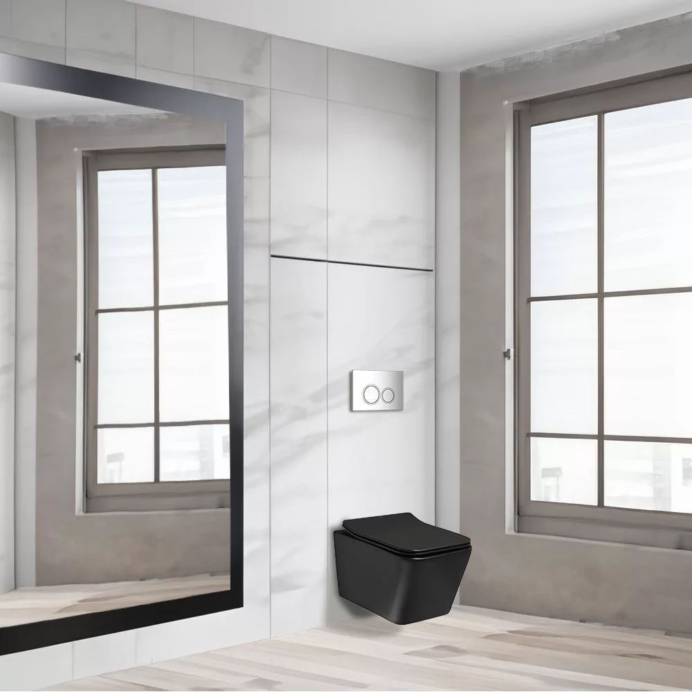 Częścią zestawu jest toaleta Tinos BLM z kowadełkiem z funkcją cichego domykania. Oznacza to, że deska sedesowa zamyka się powoli i cicho, nie zatrzaskując się nagle. Funkcja ta zapewnia komfort i ciszę, a także dłuższą żywotność deski. Toaleta Tinos jest wykonana z czarnej ceramiki, która jest łatwa w czyszczeniu i higieniczna.