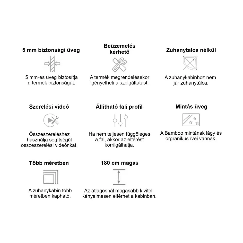 Az üveg és a profilok tisztításához enyhe mosogatószer, semleges üvegtisztító vagy hígított citromsavas oldat és puha mikroszálas kendő javasolt. Zuhanyzás után gumilehúzóval távolítsd el a vizet a vízkő ellen. Kerüld az erősen lúgos/savas vegyszereket, dörzsszivacsot és oldószereket.
