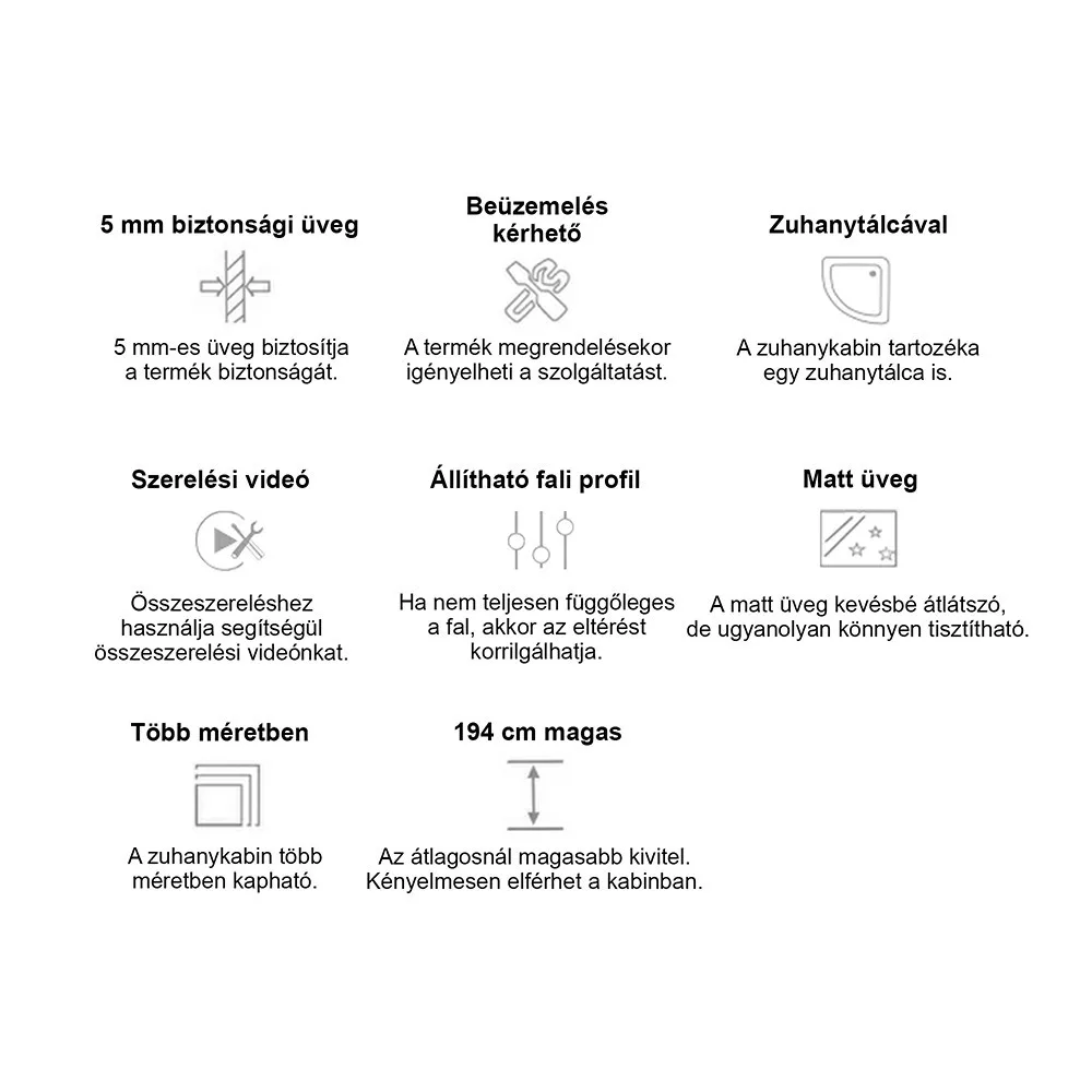 Műanyag vízzáró profilokkal rendelkezik, hogy a víz a kabinon belül maradjon. Az állítható fali profilok segítségével, ha nem teljesen függőleges a fal, akár 15 mm eltérést is korrigálhat. Amennyiben tálca nélkül rendeli, 180 cm-es magassággal, ha pedig szettben erősített akril zuhanytálcával, akkor 194 cm-es magassággal számolhat.