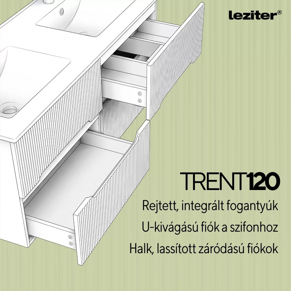 Meble łazienkowe Leziter Trent harmonijnie łączą w sobie estetykę i praktyczność. Żebrowany panel przedni nadaje mu czysty, nowoczesny charakter, a zintegrowany uchwyt pozwala na wygodne użytkowanie. Mocowanie do ściany zapewnia swobodny wygląd i przyspiesza czyszczenie podłogi. Ceramiczna umywalka jest trwała, ponadczasowa, odporna na codzienne zużycie i łatwa do utrzymania w czystości.