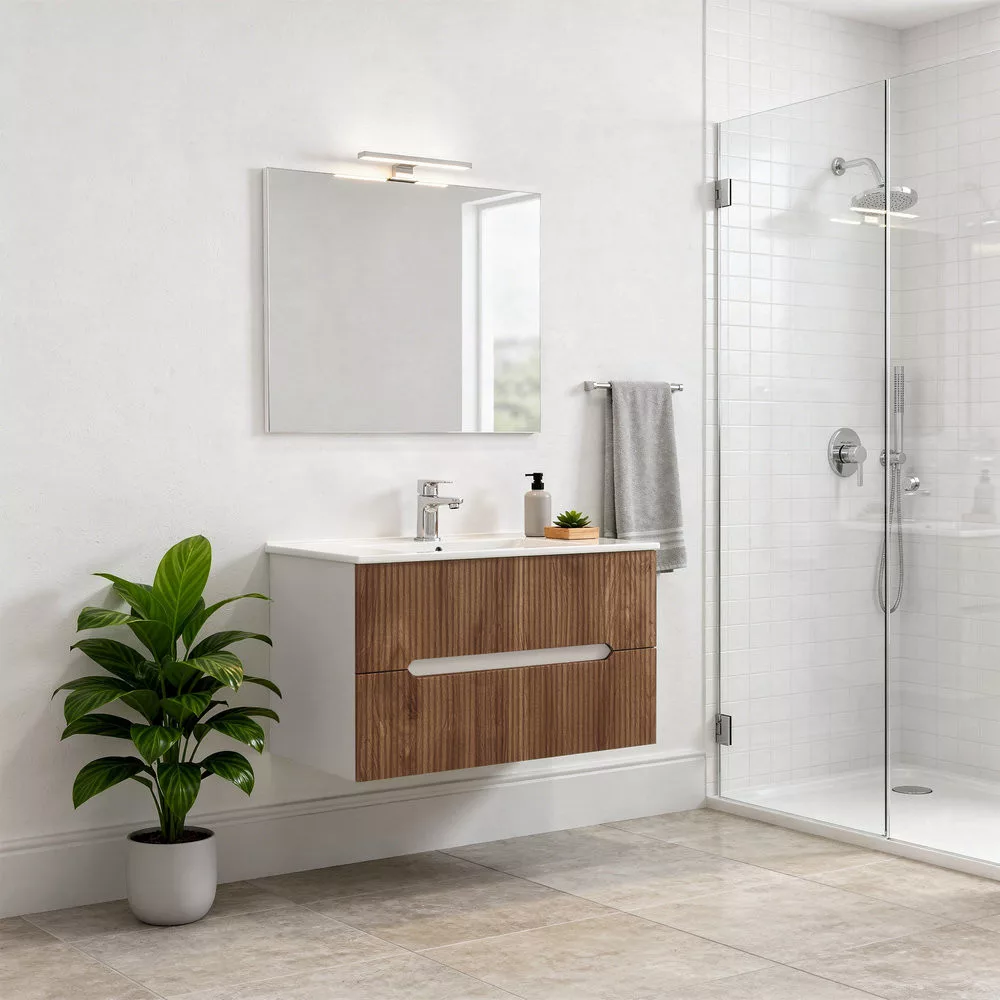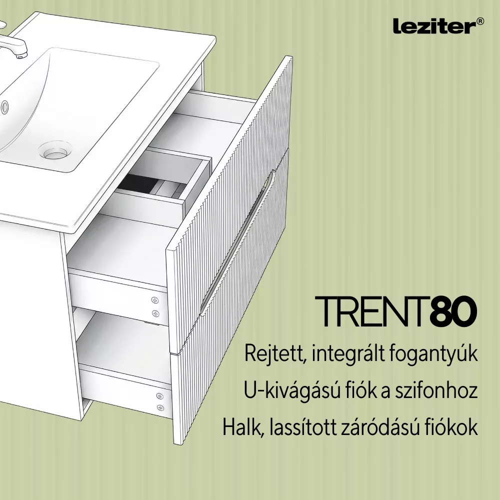 Meble łazienkowe Leziter Trent harmonijnie łączą w sobie estetykę i praktyczność. Żebrowany panel przedni nadaje mu czysty, nowoczesny charakter, a zintegrowany uchwyt pozwala na wygodne użytkowanie. Mocowanie do ściany zapewnia swobodny wygląd i przyspiesza czyszczenie podłogi. Ceramiczna umywalka jest trwała, ponadczasowa, odporna na codzienne zużycie i łatwa do utrzymania w czystości.