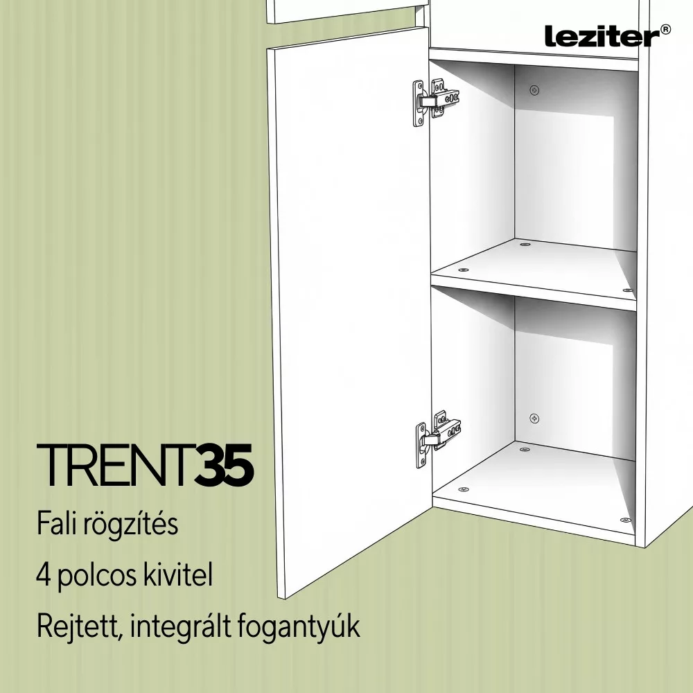Podwieszana szafka boczna Leziter Trent może być jednym z najbardziej praktycznych elementów do małych i średnich łazienek, ponieważ nie zajmuje cennej przestrzeni dzięki mocowaniu do ściany, a jednocześnie zapewnia znaczną pojemność. Odporny na wilgoć korpus z laminatu i lakierowany front są wysoce odporne na wilgotne środowisko, dzięki czemu zachowują estetyczny wygląd przez długi czas. Wewnętrzne półki ułatwiają dostęp i organizację kosmetyków, przyborów toaletowych lub ręczników, a ukryty uchwyt tworzy nowoczesny, czysty wygląd.