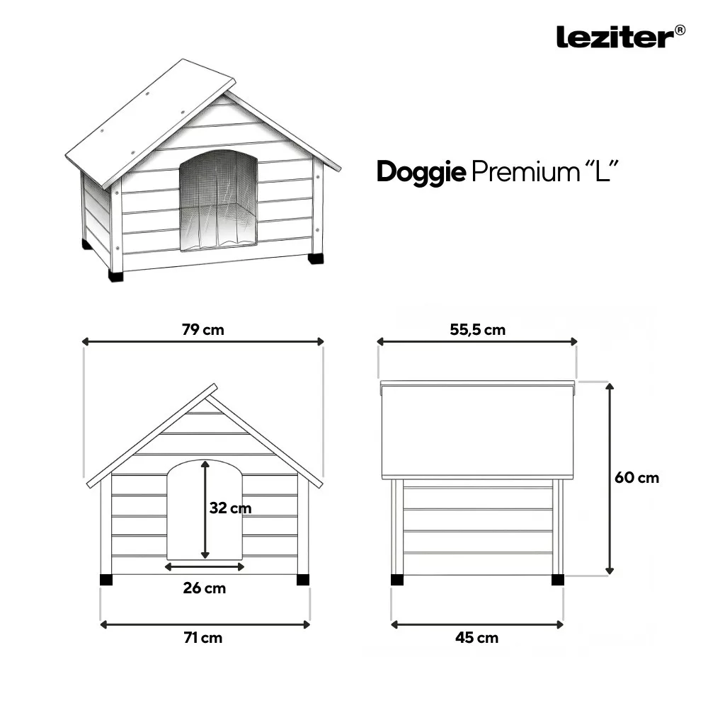 Izolowana buda dla psa Leziter Doggie Premium ma wymiary 80×55×60 cm i jest wykonana z trójwarstwowych ścian składających się z drewna sosnowego o grubości 10 mm, pianki EPS o grubości 20 mm i sklejki o grubości 3 mm. Ta izolowana konstrukcja chroni zwierzę przed zimnem w zimie i upałem w lecie, zapewniając przyjemny klimat wewnątrz przez cały czas.