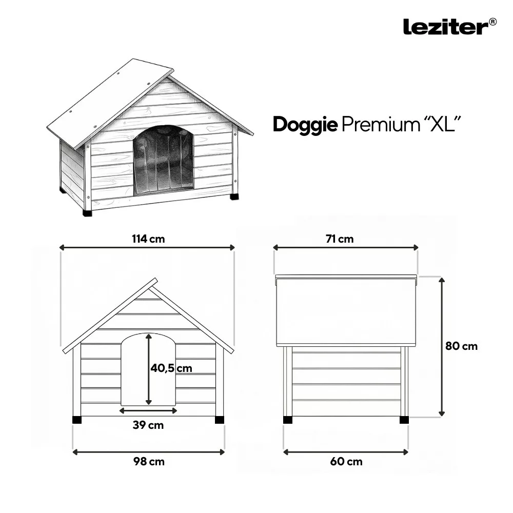 Izolowana budadla psa LeziterDoggie Premium ma wymiary 81×70×114 cm i jest wykonana z trójwarstwowych ścian składających się zdrewna sosnowego o grubości 10 mm,pianki EPS o grubości 20 mm isklejki o grubości 3mm . Ta izolowana termicznie konstrukcja chroni zwierzę przed zimnem w zimie i upałem w lecie, dzięki czemu we wnętrzu zawsze panuje przyjemny klimat.
