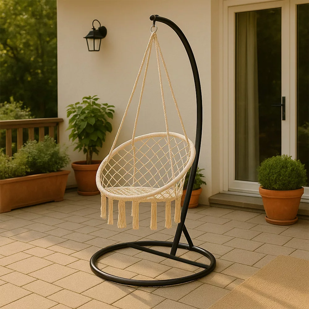 Kolejnym kluczowym elementem zestawu jest malowany proszkowo na czarno stalowy stojak hamakowy, który pozwala cieszyć się bujanym fotelem nie tylko po przymocowaniu go do drzewa lub sufitu. Okrągła podstawa jest niezwykle stabilna, a zakrzywiona konstrukcja nośna równomiernie rozkłada obciążenie, dzięki czemu można spokojnie się oprzeć.