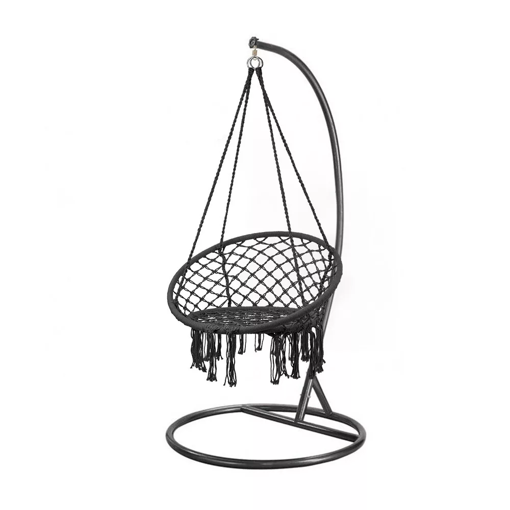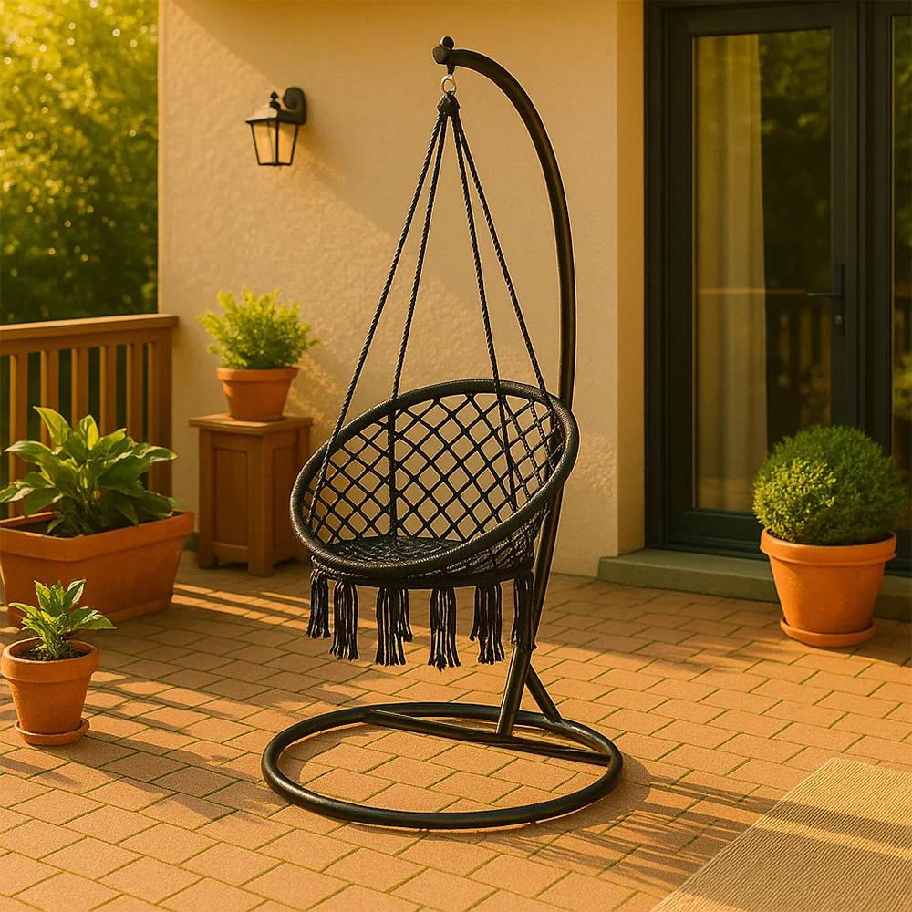 Kolejnym kluczowym elementem zestawu jest malowany proszkowo na czarno stalowy stojak hamakowy, który pozwala cieszyć się bujanym fotelem nie tylko po przymocowaniu go do drzewa lub sufitu. Okrągła podstawa jest niezwykle stabilna, a zakrzywiona konstrukcja nośna równomiernie rozkłada obciążenie, dzięki czemu można spokojnie się oprzeć.