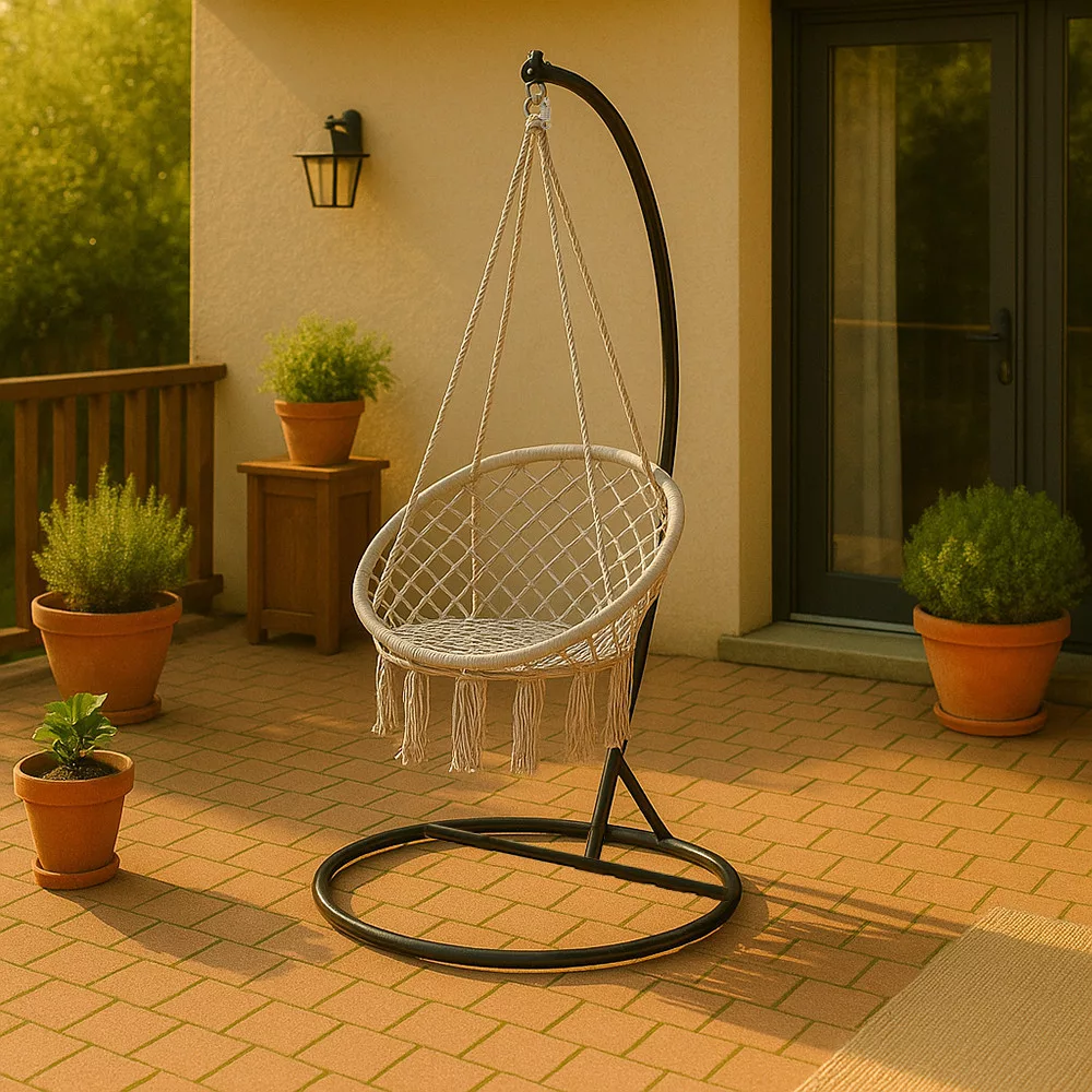 Kolejnym kluczowym elementem zestawu jest malowany proszkowo na czarno stalowy stojak hamakowy, który pozwala cieszyć się bujanym fotelem nie tylko po przymocowaniu go do drzewa lub sufitu. Okrągła podstawa jest niezwykle stabilna, a zakrzywiona konstrukcja nośna równomiernie rozkłada obciążenie, dzięki czemu można spokojnie się oprzeć.