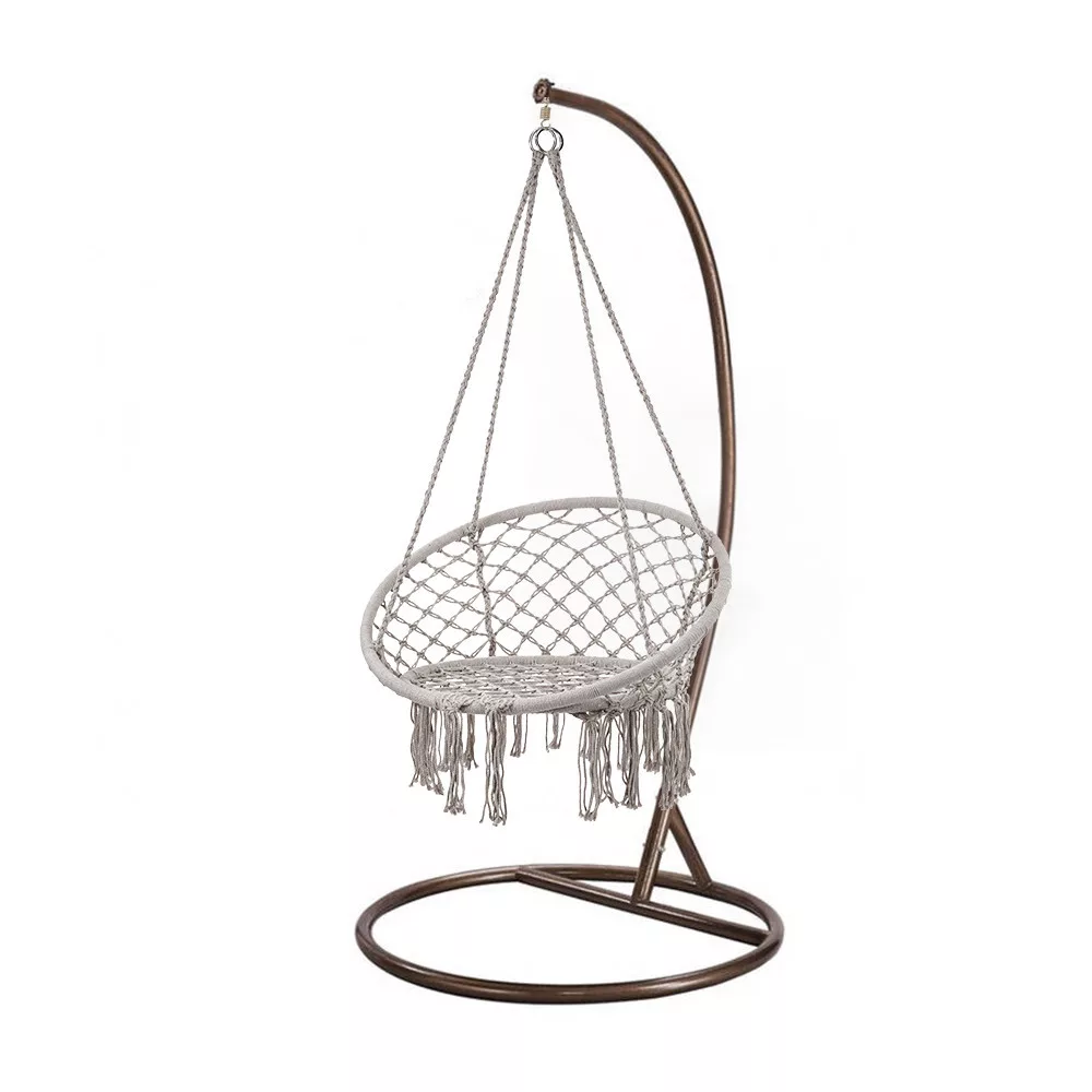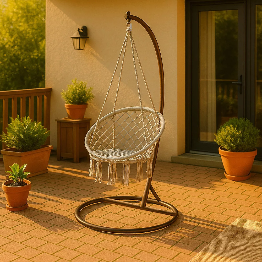 Kolejnym kluczowym elementem zestawu jest malowany proszkowo na brązowo stalowy stojak hamakowy, który pozwala cieszyć się bujanym fotelem nie tylko po przymocowaniu go do drzewa lub sufitu. Okrągła podstawa jest niezwykle stabilna, a zakrzywiona konstrukcja nośna równomiernie rozkłada obciążenie, dzięki czemu można spokojnie się oprzeć.