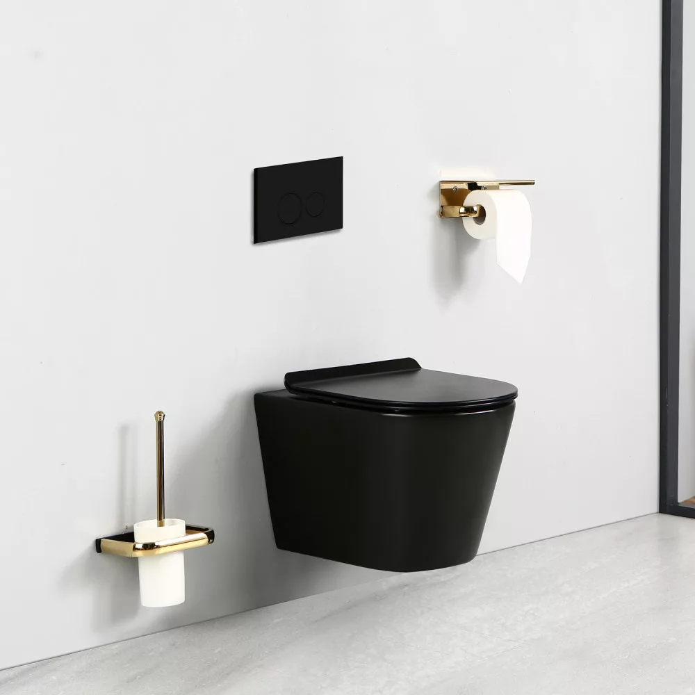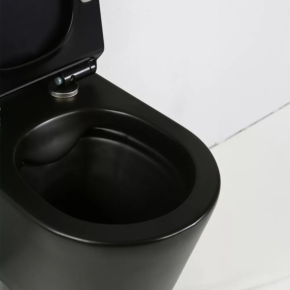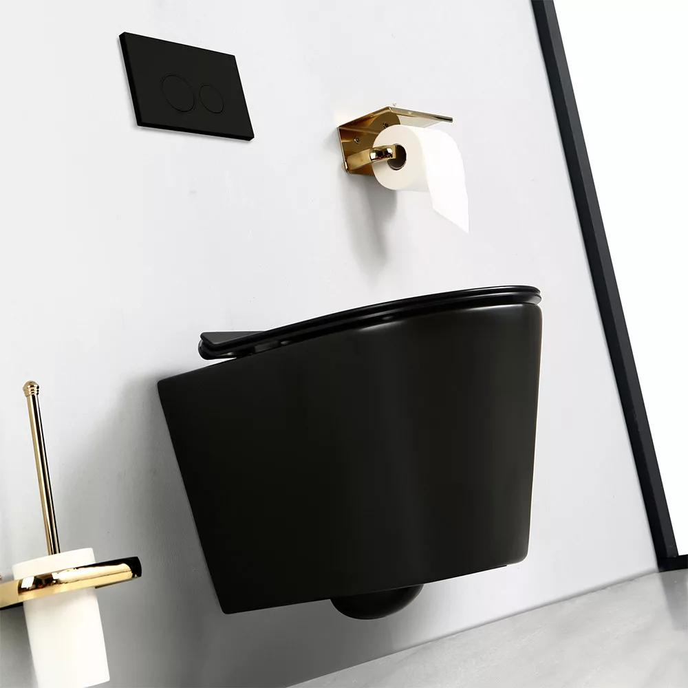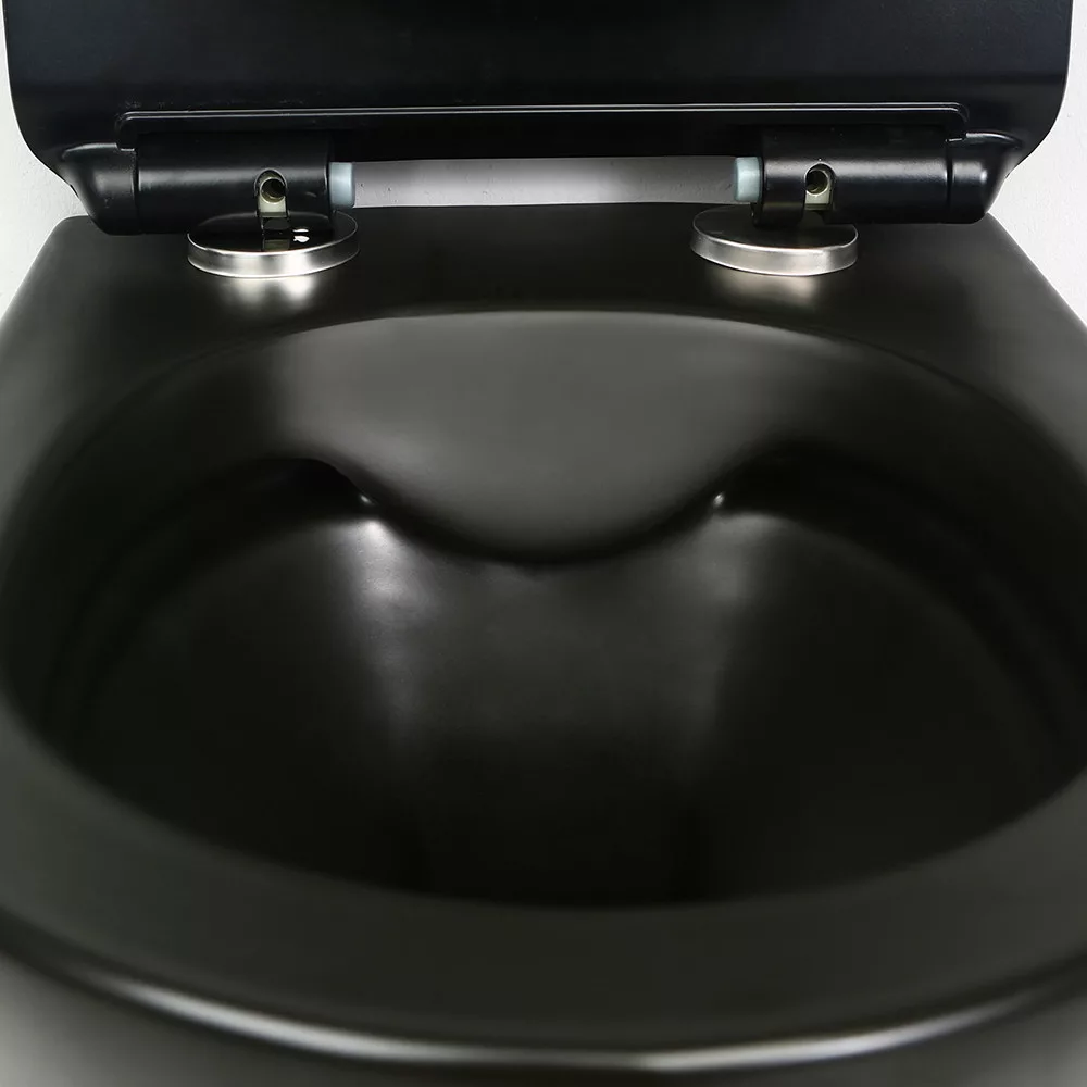 Montowana na ścianie, bezramkowa toaleta Ride w kolorze czarnym przenosi higienę i estetykę łazienki na nowy poziom.
