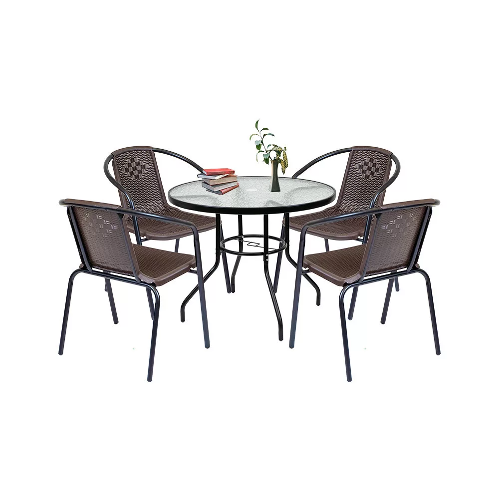 A modern kivitelű kerti bútorkészlet egy kerti üveglapos asztalt és 4 széket tartalmaz. A bútorokat 4 fő számára tervezték. A székek és az asztal lábazata acélból készül. Az asztallap 5 mm-es edzett üvegből készült, amely ellenáll a kisebb karcolásoknak. A műanyag szék ülésanyaga ellenáll az időjárási viszonyoknak. Előnye az ergonómikusan profilált ülés és karfa, amelyek tehermentesítik a vállakat pihenés közben.