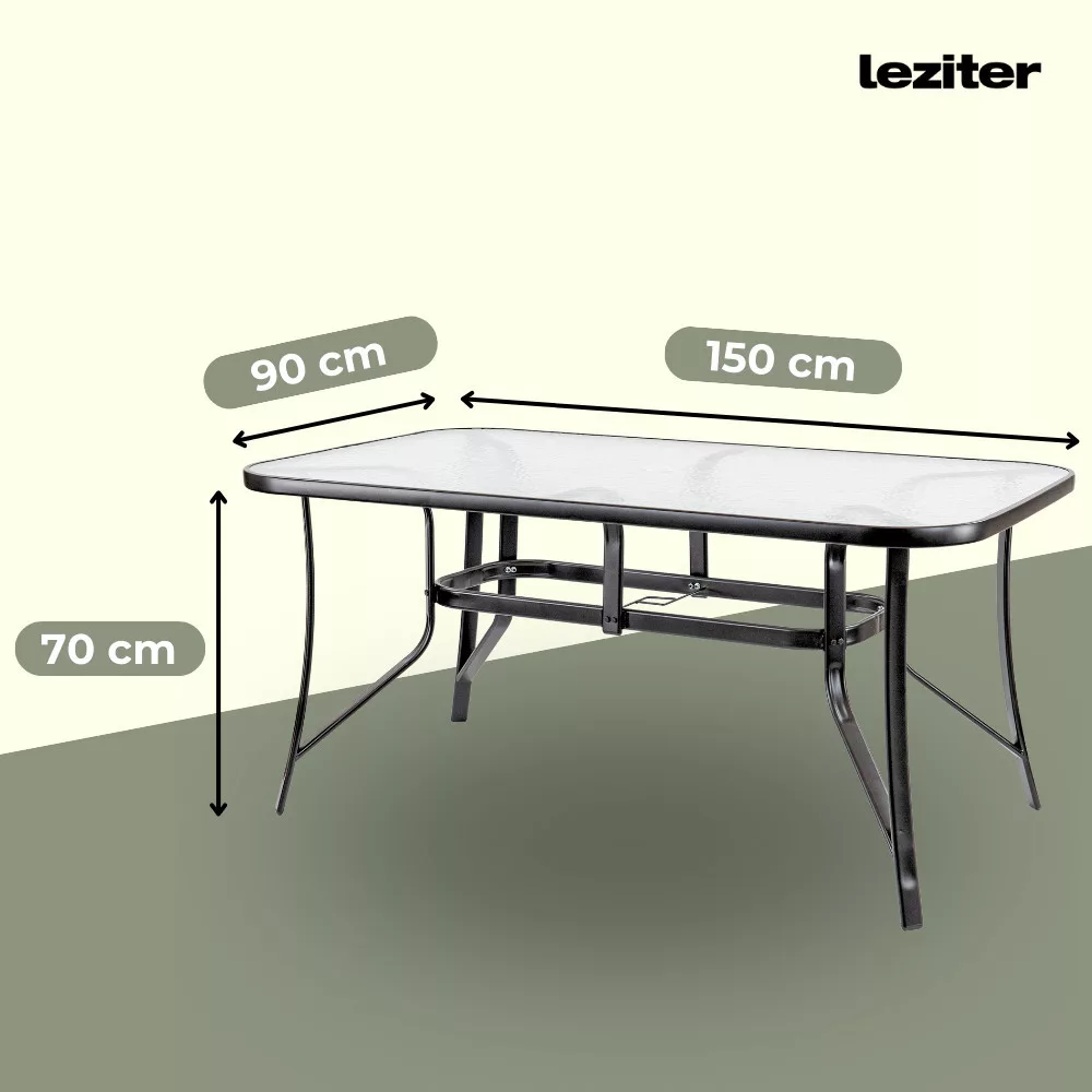 A garnitúra tartalmaz egy téglalap alakú, 150x90 cm-es üvegasztalt, valamint négy Lugo összecsukható fémvázas kerti széket, amelyek 7 különböző pozícióba állíthatók, hogy a lehető legkényelmesebb ülést biztosítsák.