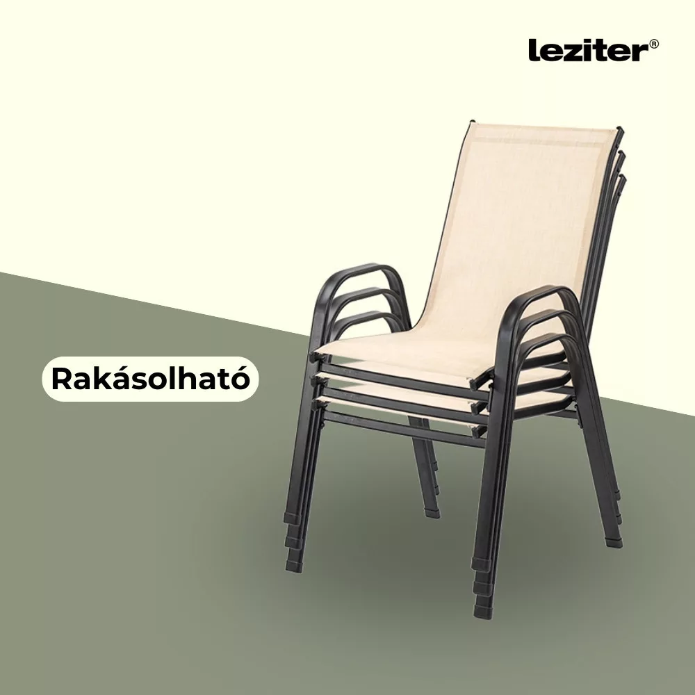 A modern kivitelű kerti bútorkészlet egy kerti üveglapos asztalt és 4 széket tartalmaz, a székek teherbírása 120 kg. A bútorokat 4 fő számára tervezték. A székek és az asztal lábazata fémből készül. Az asztallap 5 mm-es edzett üvegből készült, amely ellenáll a kisebb karcolásoknak. Az textilén szék ülésanyaga ellenáll az időjárási viszonyoknak. Előnye az ergonómikusan profilált ülés és karfa, amelyek tehermentesítik a vállakat pihenés közben.