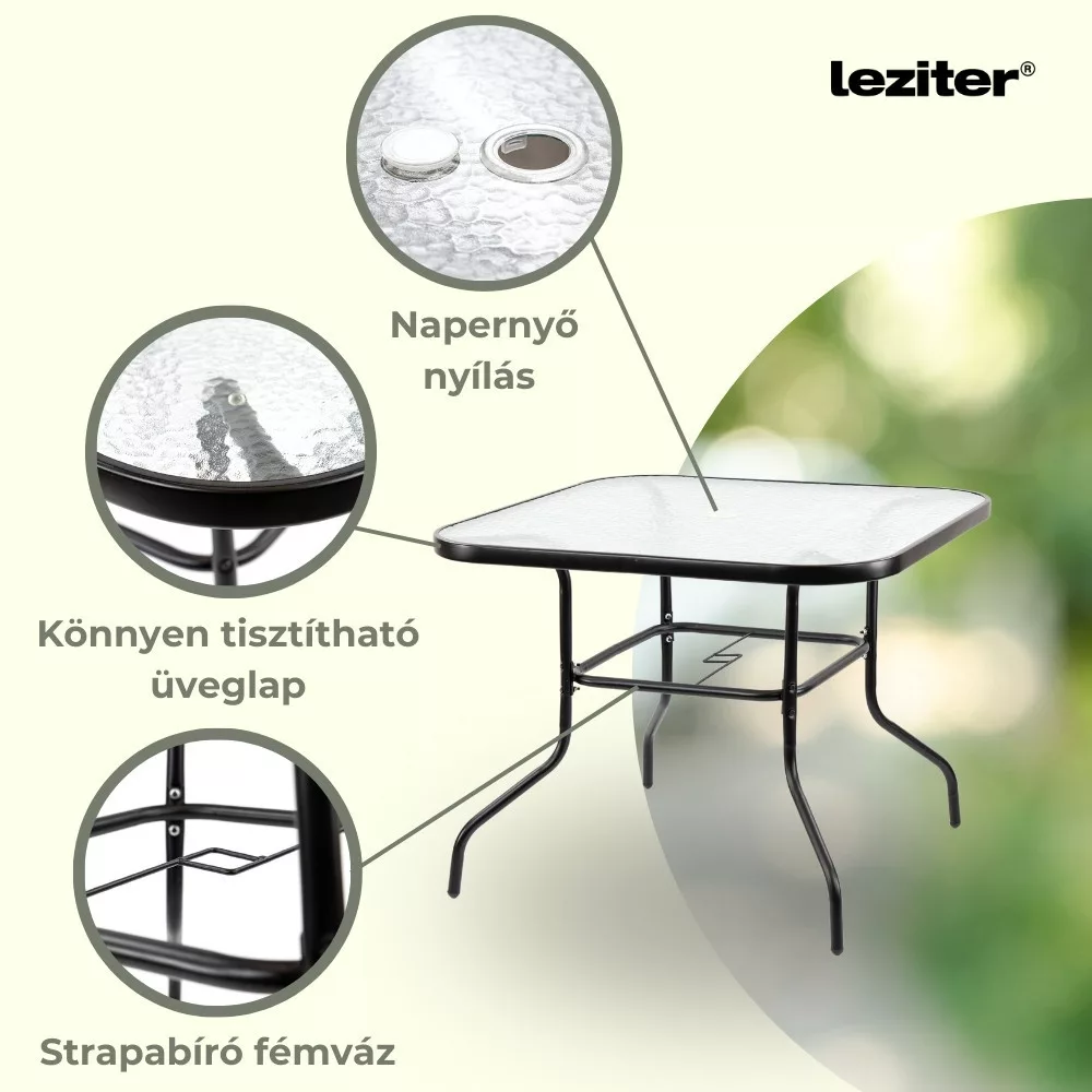 A modern kivitelű kerti bútorkészlet egy kerti üveglapos asztalt és 4 széket tartalmaz, melyek teherbírása 120 kg. A bútorokat 4 fő számára tervezték. A székek és az asztal lábazata fémből készül. Az asztallap 5 mm-es edzett üvegből készült, amely ellenáll a kisebb karcolásoknak. Az textilén szék ülésanyaga ellenáll az időjárási viszonyoknak. Előnye az ergonómikusan profilált ülés és karfa, amelyek tehermentesítik a vállakat pihenés közben.