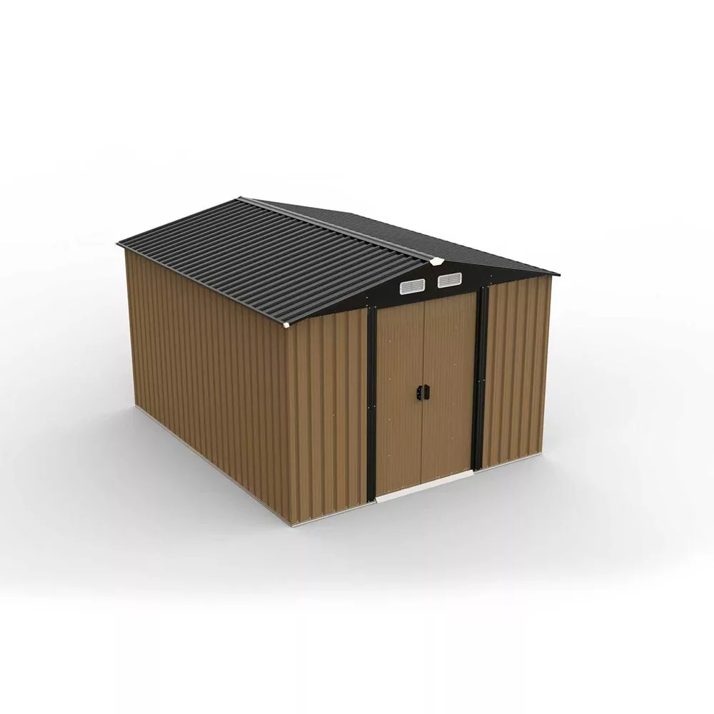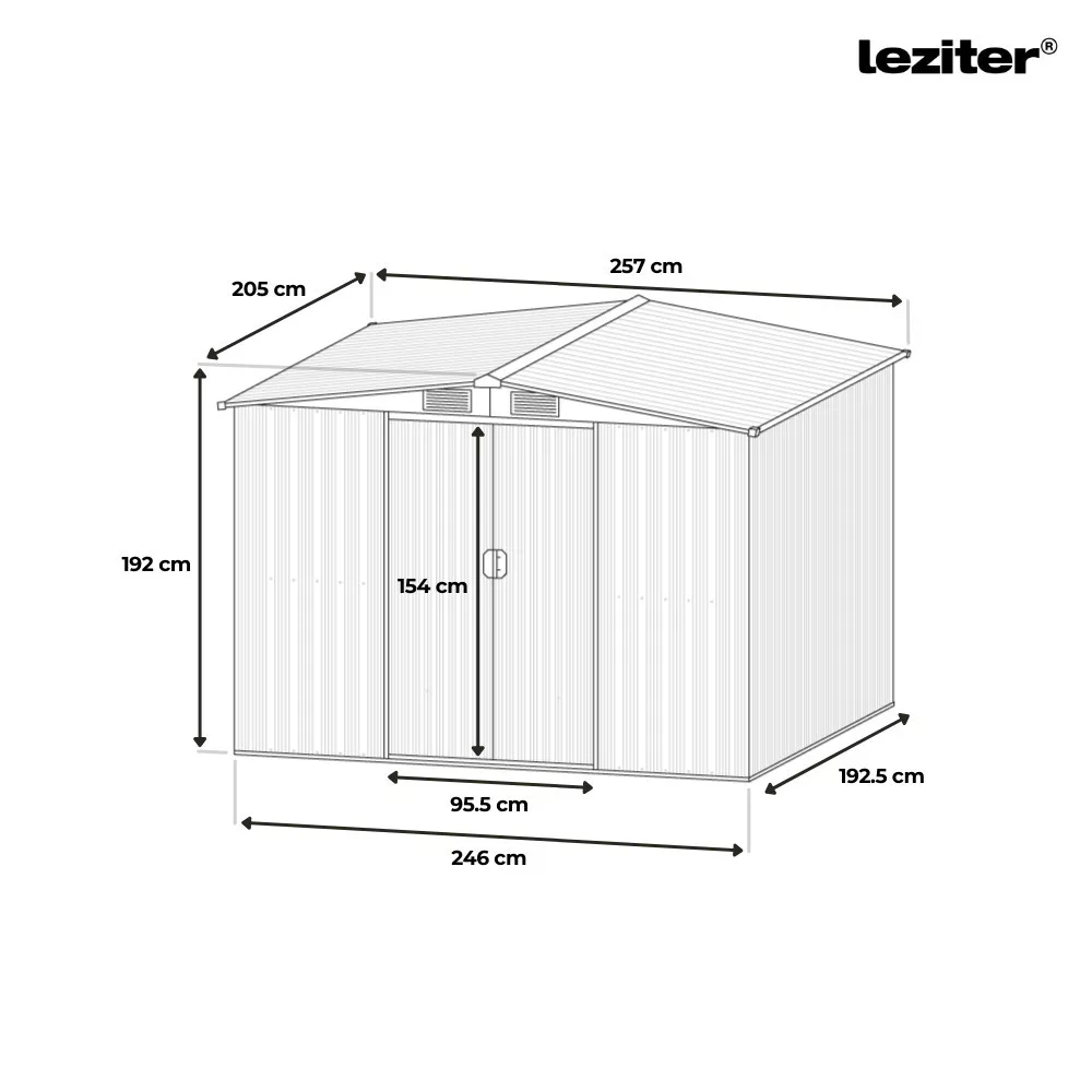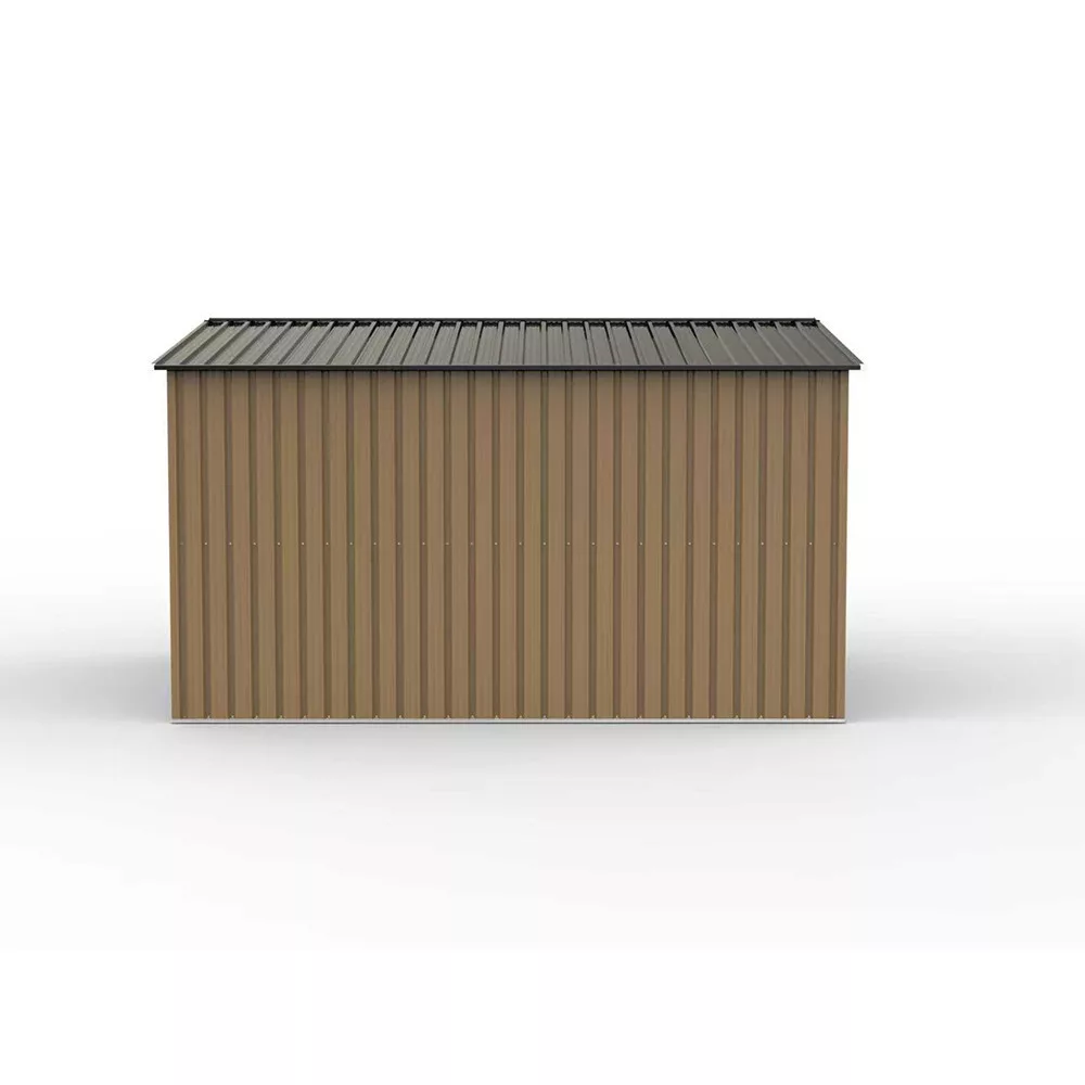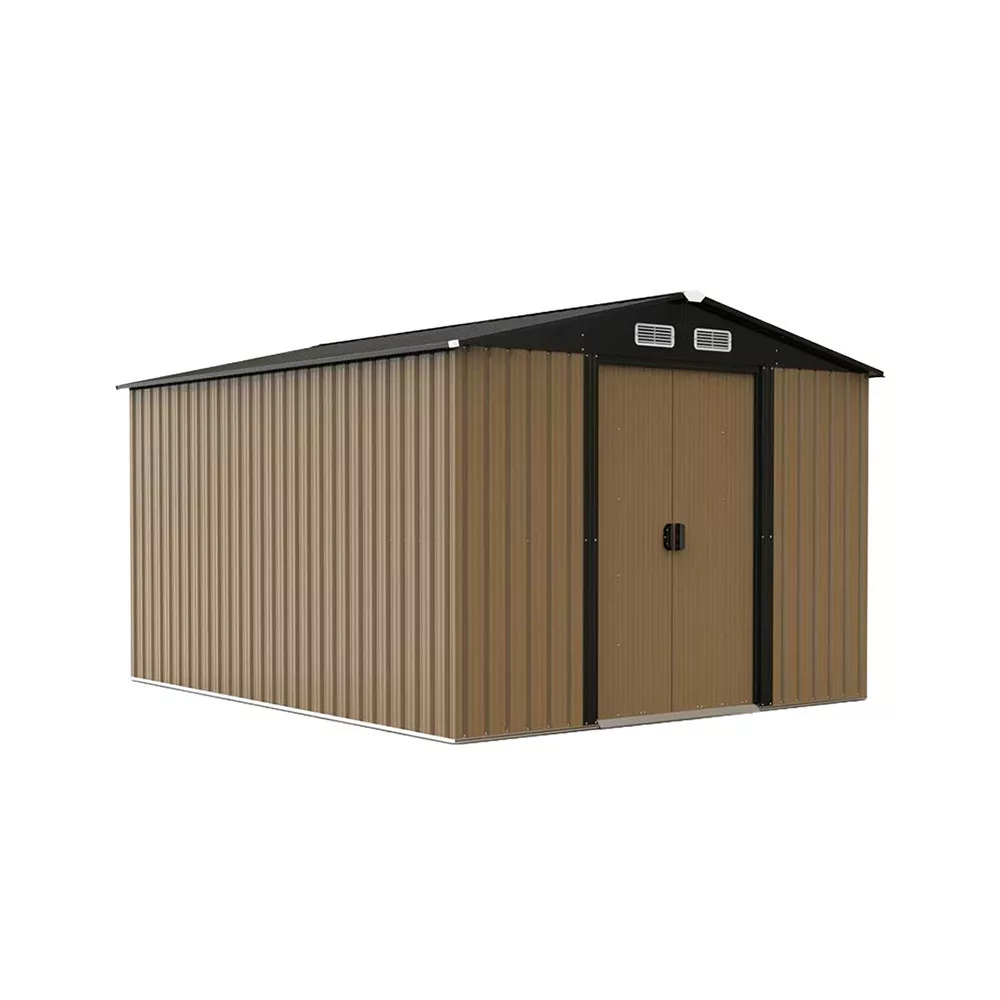 A szerkezet alapját horganyzott acél váz adja, amely stabil tartást biztosít a teljes felépítménynek. A falak színezett acéllemezből készülnek. Ez a kialakítás hosszú távon is megbízható megoldást jelent a kerti tárolásra.