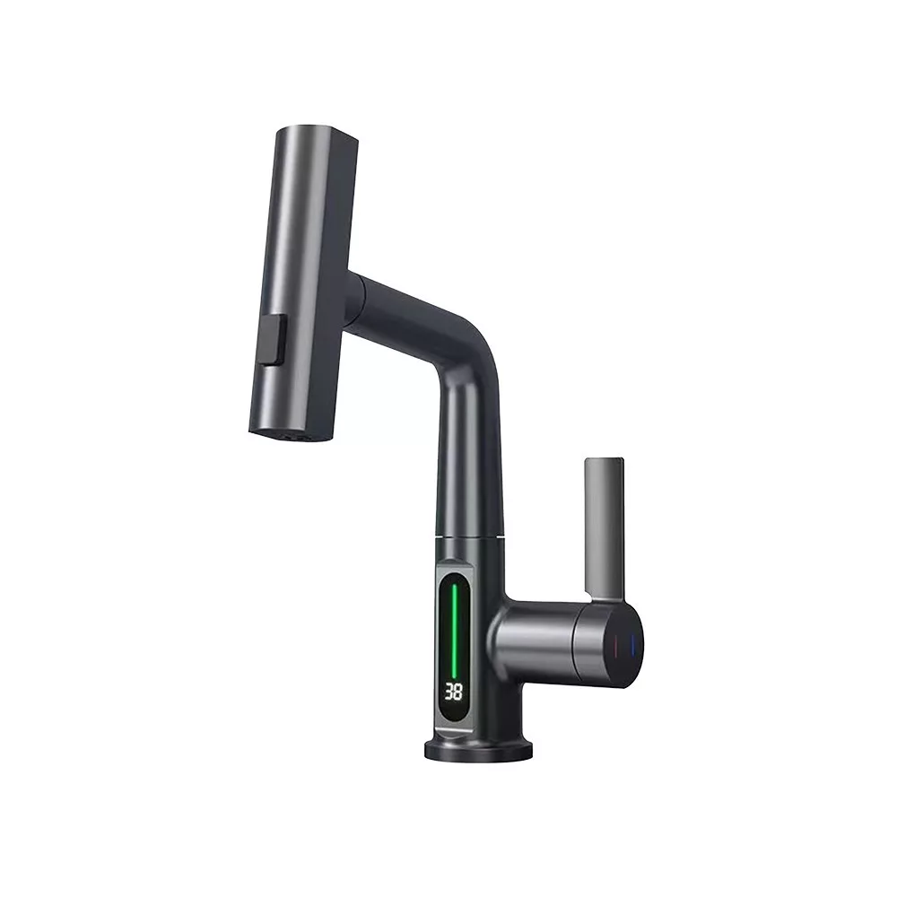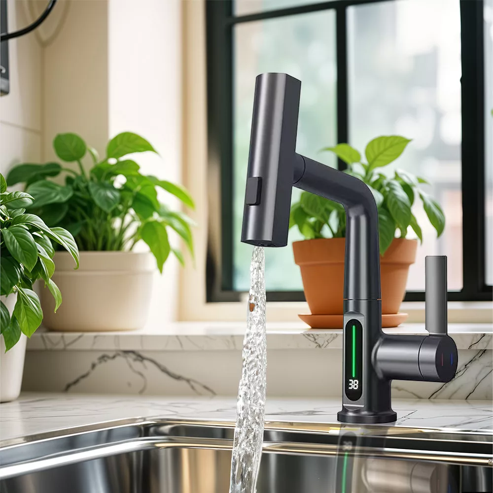 Czy na kranie znajduje się cyfrowy wyświetlacz temperatury? Tak, kran ma wbudowany cyfrowy wyświetlacz temperatury, który dokładnie pokazuje temperaturę wody w różnych kolorach: niebieskim (0-30°C), zielonym (30-40°C) i czerwonym (40-49°C).