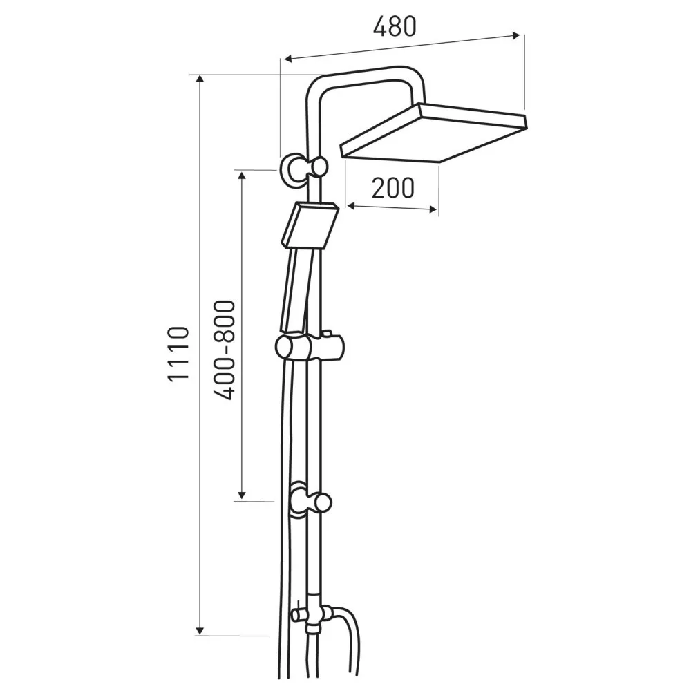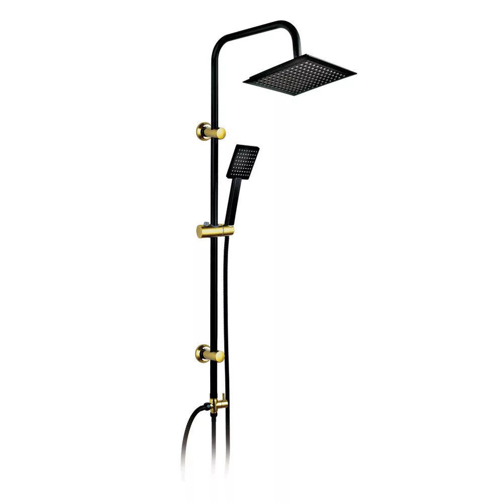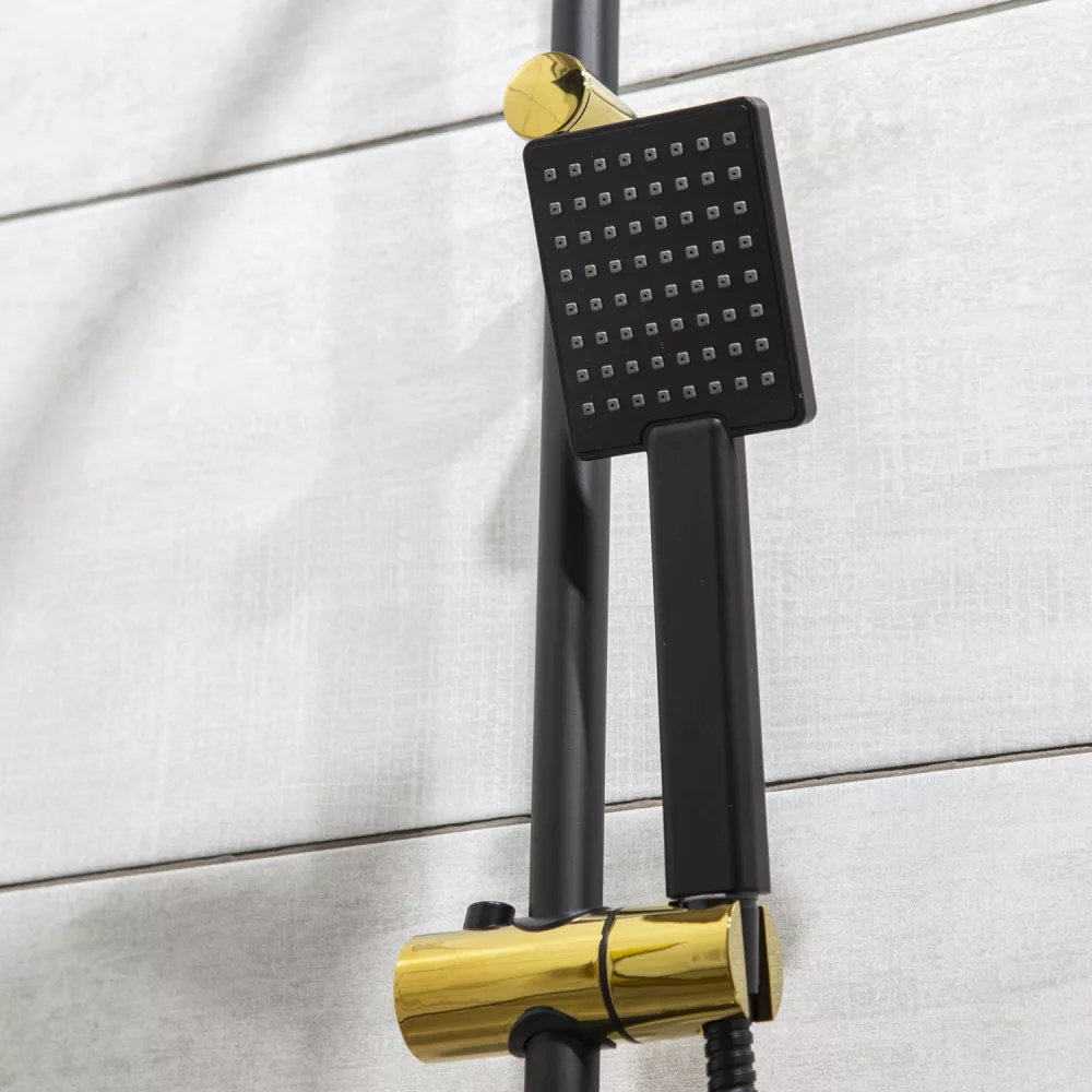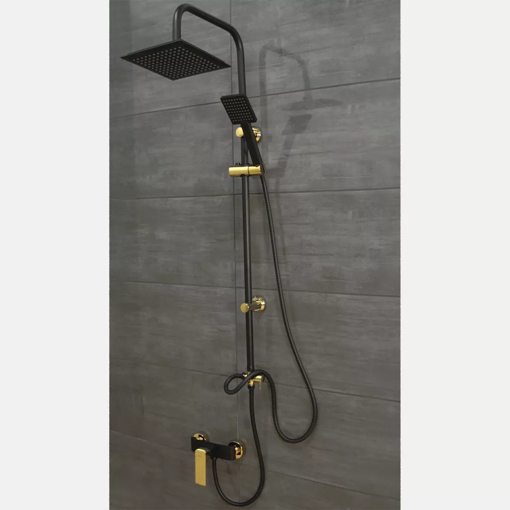 Czarny zestaw prysznicowy ze złotymi dodatkami ma wymiary 110 x 20,5 x 48 cm. Rozstaw uchwytów na deszczownicy można regulować w zakresie od 30 do 80 cm. Zestaw prysznicowy Denis 63 został wyposażony w trwały i odporny na uszkodzenia wąż o długości 150 cm oraz uchwyt, który pozwala na wygodne zawieszenie główki prysznicowej. Znajdujące się w zestawie słuchawka prysznicowa i deszczownica posiadają jeden rodzaj dyszy. Zestaw prysznicowy Denis 63 posiada elegancką kwadratową deszczownicę w kolorze złotym. Jej wymiary to 20x20 cm.