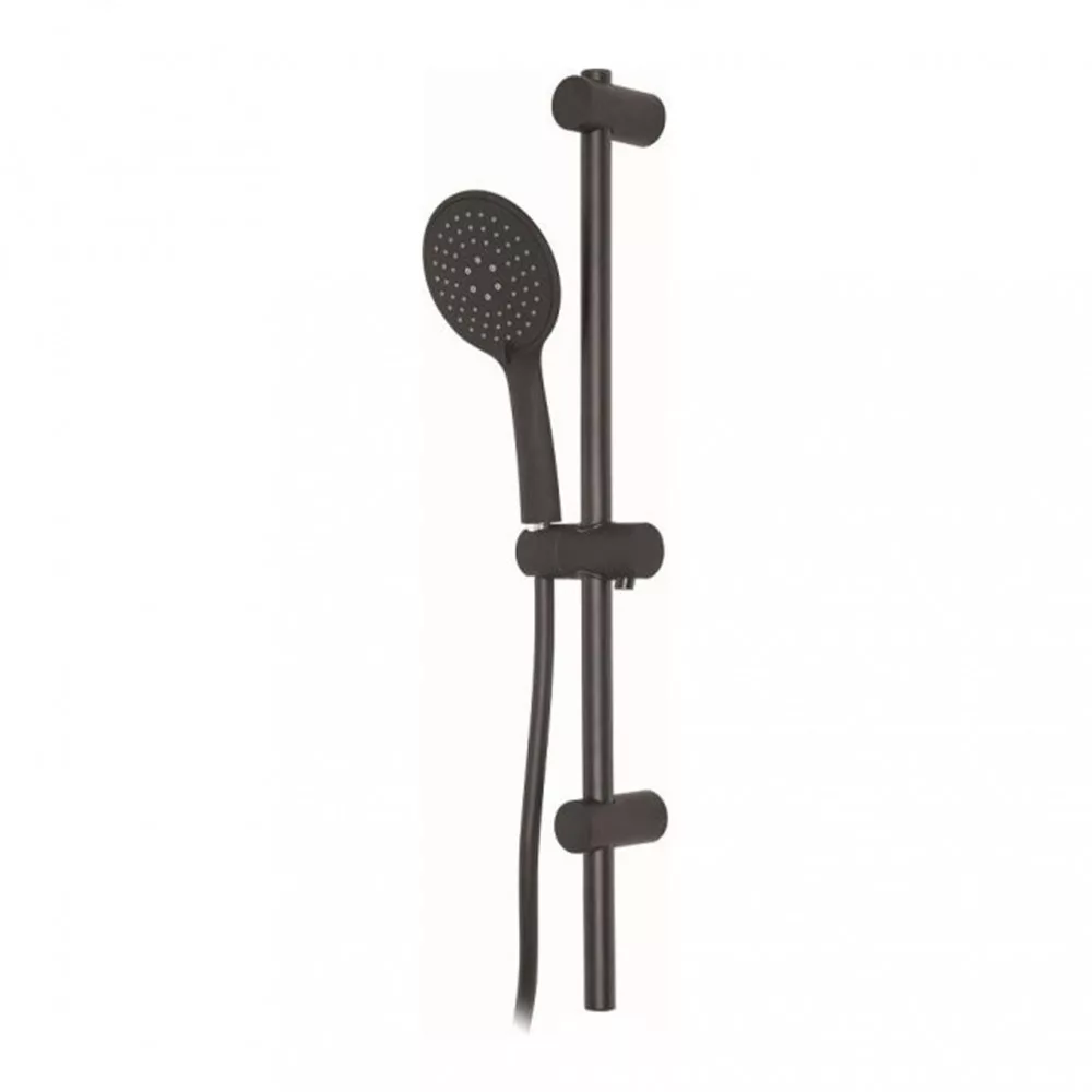 Zoya to czarny, matowy zestaw prysznicowy, który można zamontować na ścianie. Wystarczy podłączyć go do wody i przymocować drążek lub wspornik za pomocą śrub. Dzięki temu montaż zestawu prysznicowego w łazience jest szybki i łatwy. Odległość między wspornikami wynosi 61 cm.
