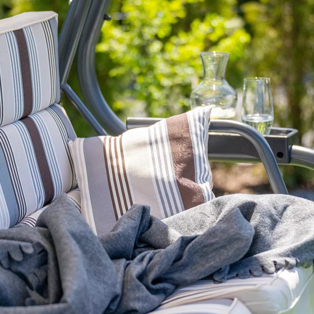 Huśtawka ogrodowa Ines posiada parasol przeciwsłoneczny z regulacją nachylenia, wygodne poduszki na siedzisku i oparciu, półki na napoje oraz dodatkowe poduszki dekoracyjne. Dzięki funkcji składania huśtawka Ines gwarantuje relaks.