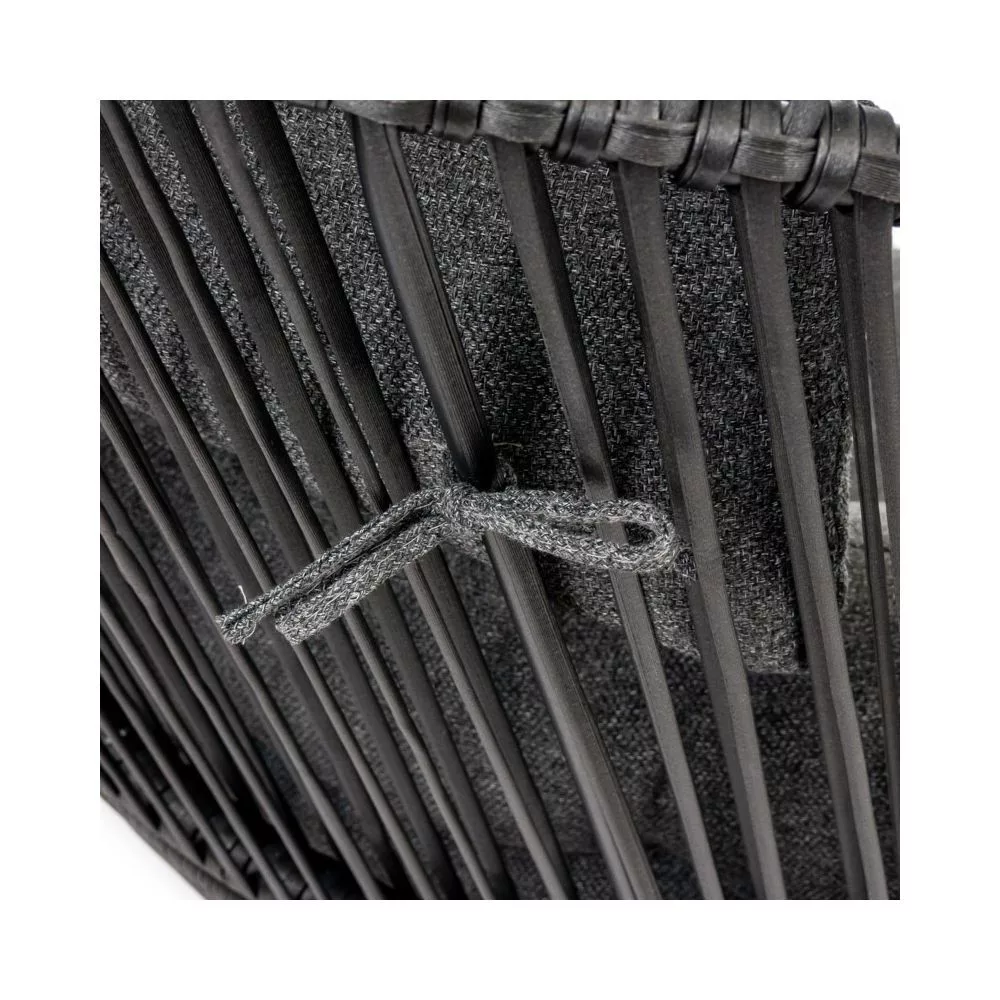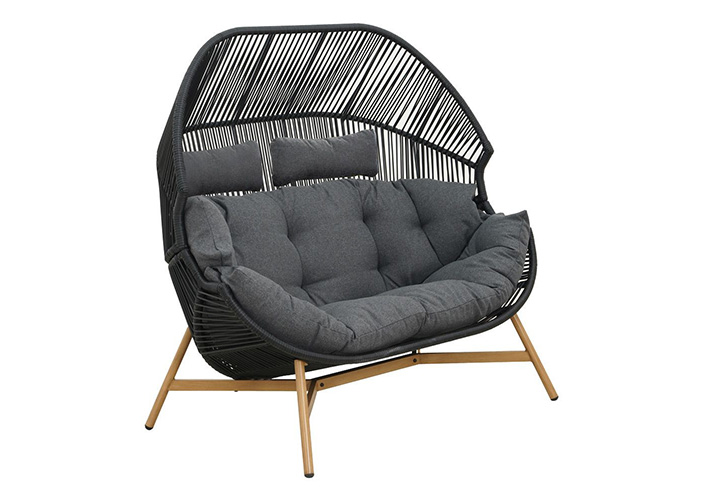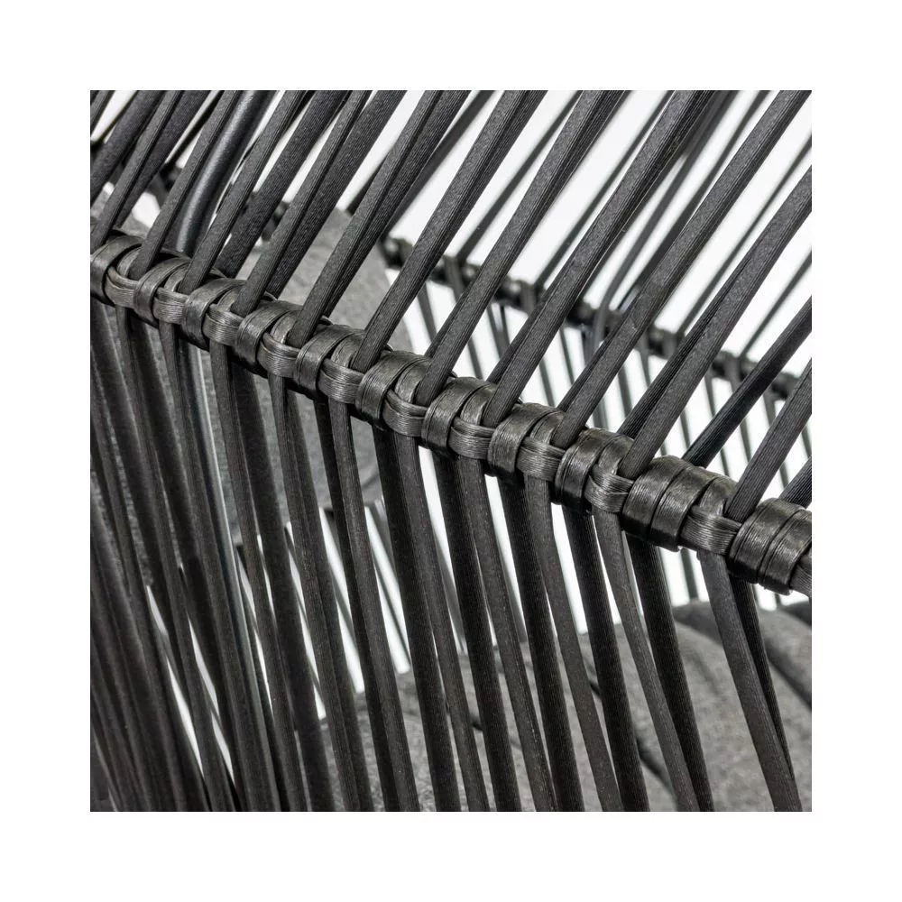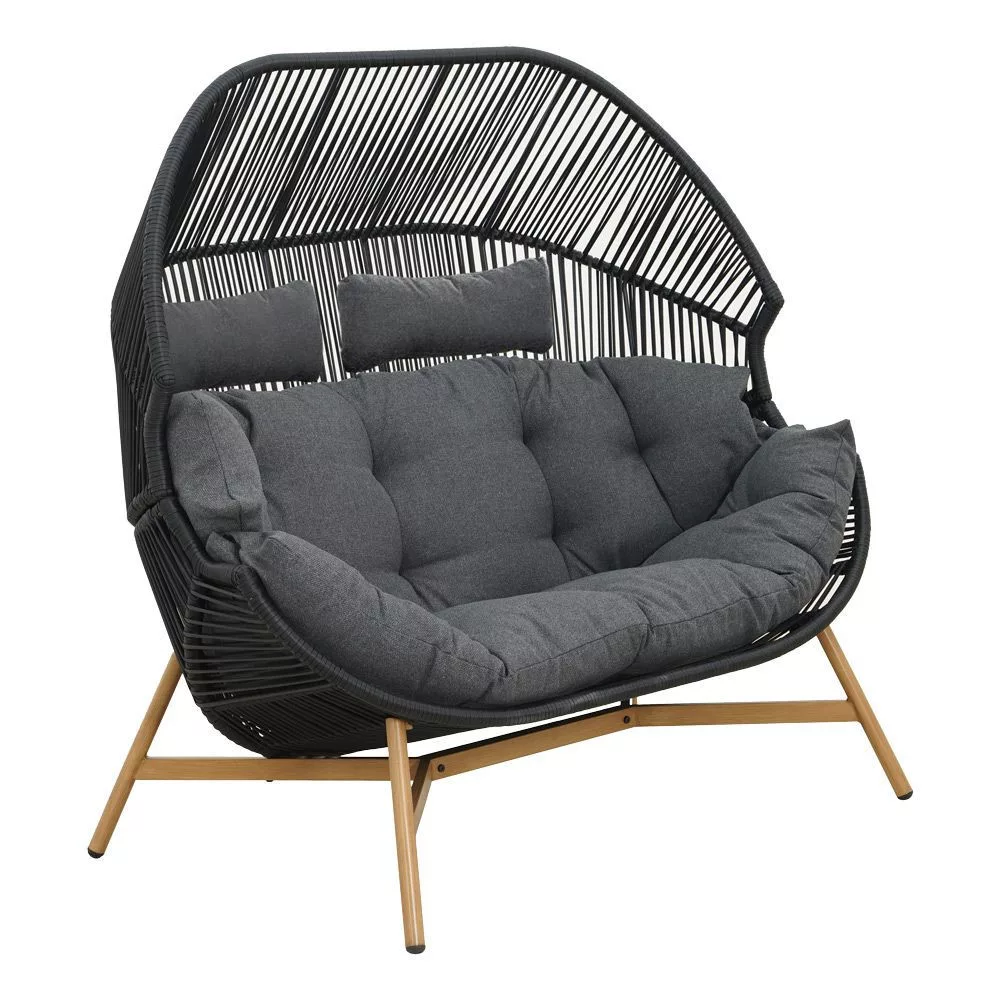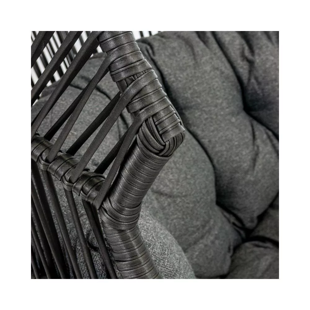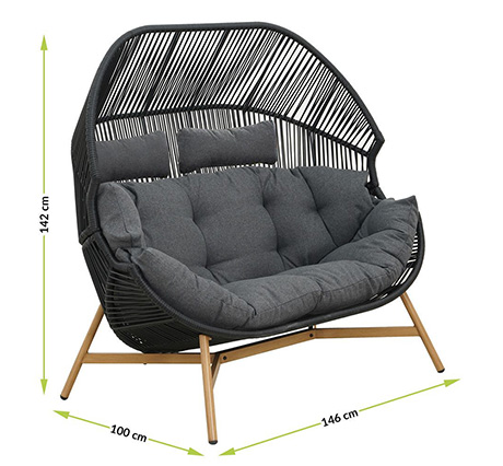Podwójny fotel ogrodowy posiada stabilną konstrukcję dzięki zastosowaniu stalowego stelaża. Wpływa to na trwałość mebla i komfort użytkowania - doskonale sprawdzi się przez wiele sezonów. Kosz z wikliny rattanowej jest optymalnie wyprofilowany, by zapewnić użytkownikom najwyższy poziom relaksu. Czerń fotela przełamana jest kolorem nóżek imitujących drewno. Fotel tarasowy wyposażony jest w dużą poduszkę siedziskową oraz dwie poduszki oparciowe. Wykonane z puchatego poliestru są miękkie i łatwe w czyszczeniu. Dzięki zastosowanym materiałom fotel posłuży przez długi czas.
