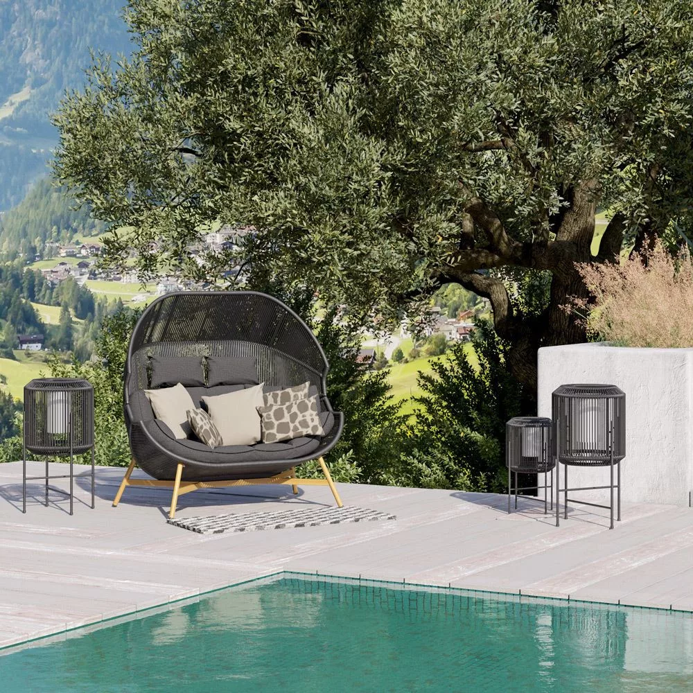 Relaks we dwoje może być teraz jeszcze przyjemniejszy dzięki dużemu, wyściełanemu fotelowi. Ergonomiczny kosz został zaprojektowany z myślą o relaksie w dowolnej pozycji. Całość konstrukcji dopełnia miękka poduszka, która dodatkowo zwiększa komfort wypoczynku. Dwuosobowy fotel wyróżnia się oryginalnym designem zgodnym z aktualnymi trendami. Połączenie czarnego kosza z drewnianymi nogami prezentuje się bardzo nowocześnie. Fotel ogrodowy ze stali czarnej to propozycja do modnych wnętrz w różnych stylach.