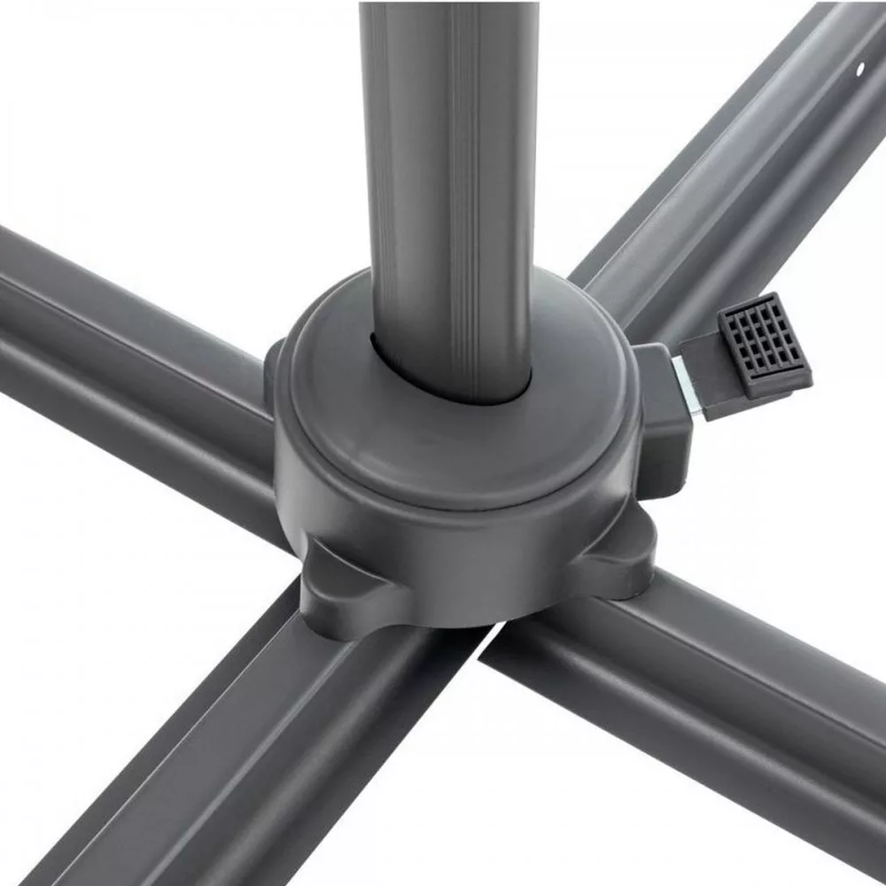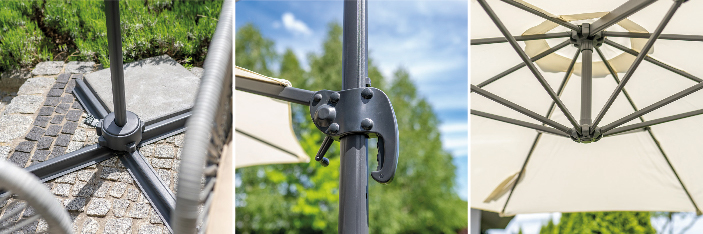 Na stabilność parasola ogrodowego istotny wpływ ma krzyżowa podstawa. Dla wygody użytkownika można ją łatwo złożyć za pomocązamocowanego na stałe uchwytu . Zaletą parasola jest połączenie mechanizmu obrotowego w podstawie i regulacji kąta nachylenia.Pozwala to na dowolne ustawienie parasola i dobranie pozycji zacienienia w zależności od kąta padania promieni słonecznych.