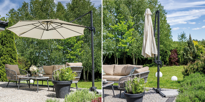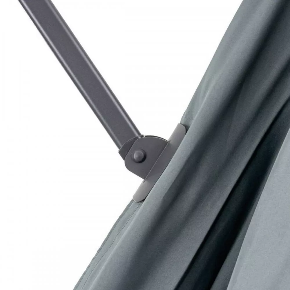 Osłona przeciwsłoneczna jest umieszczona z boku konstrukcji, umożliwiając 100% wykorzystanie zacienionego obszaru.Parasol przeciwsłoneczny pozwala stworzyć zacienione miejsce do relaksu, wspólnego posiłku lub spotkania z bliskimi. Parasole ogrodowe to niezbędny element wyposażenia ogrodu. Zapewniają doskonałą ochronę zarówno przed słońcem, jak i letnim deszczem.