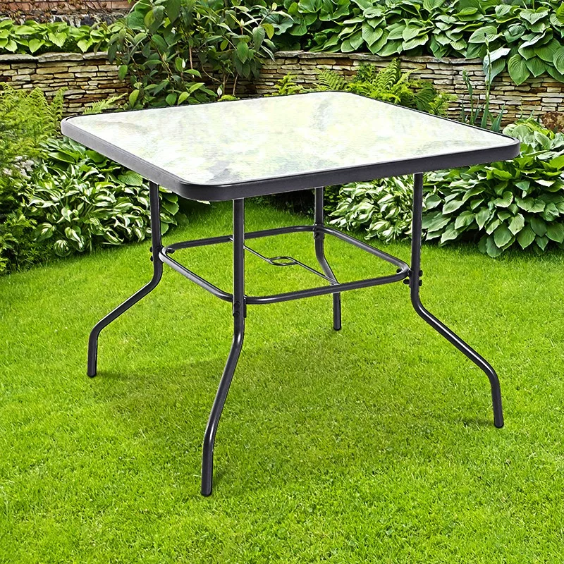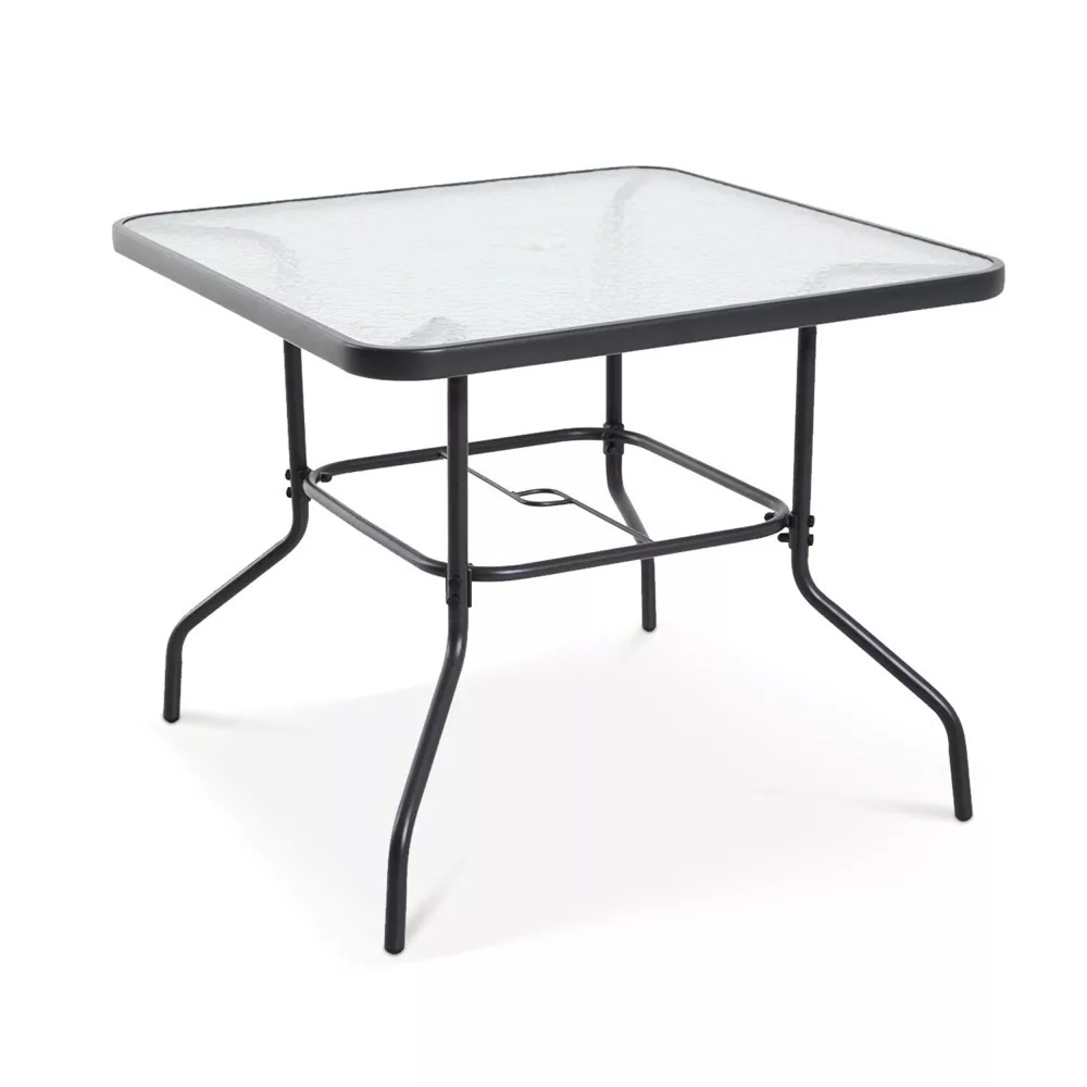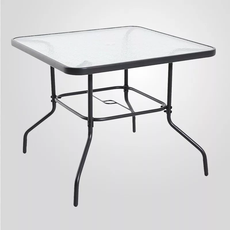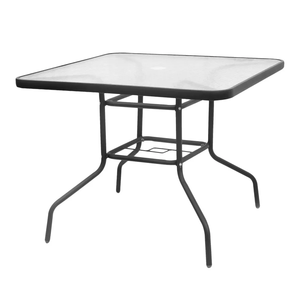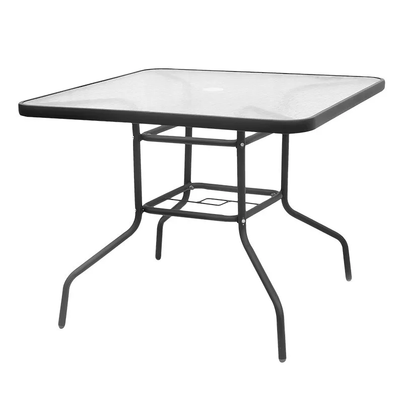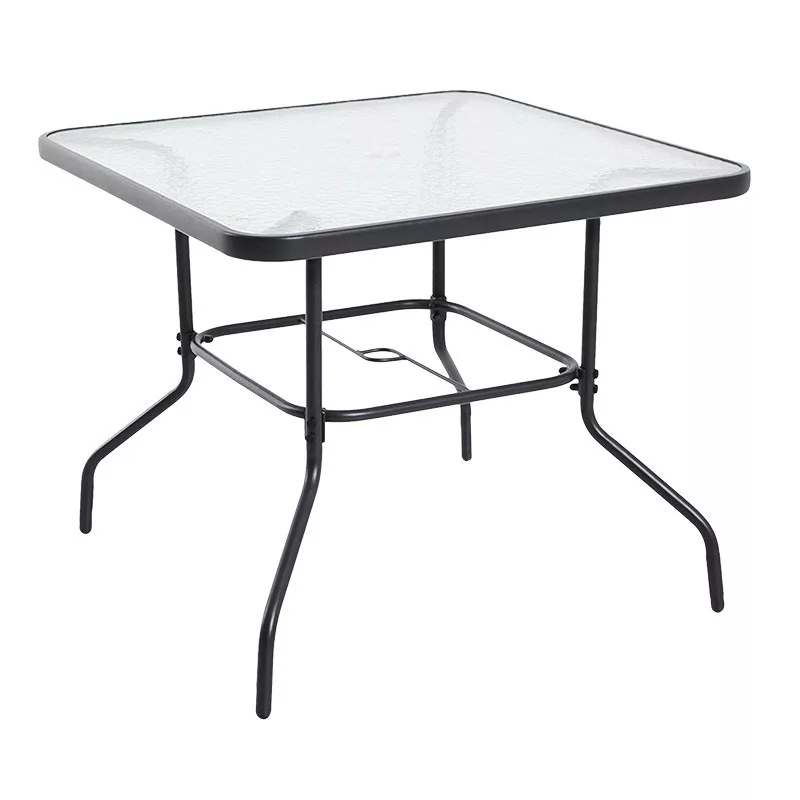 Stalowy stół ogrodowy z kwadratowym szklanym blatemIdealny stalowy stół ogrodowy z kwadratowym szklanym blatem do ogrodu lub patio.Blat stołu wykonany jest z 5 mm szkła hartowanego z otworem na parasol. Stół jest trwały, a rama wykonana jest z solidnego materiału - stali. Łatwy do czyszczenia.Materiał ramy: stal 24 x 0,8 mmMateriał blatu: szkło hartowane 5 mmRozmiar blatu: 90 x 90 cmWysokość: 72 cm