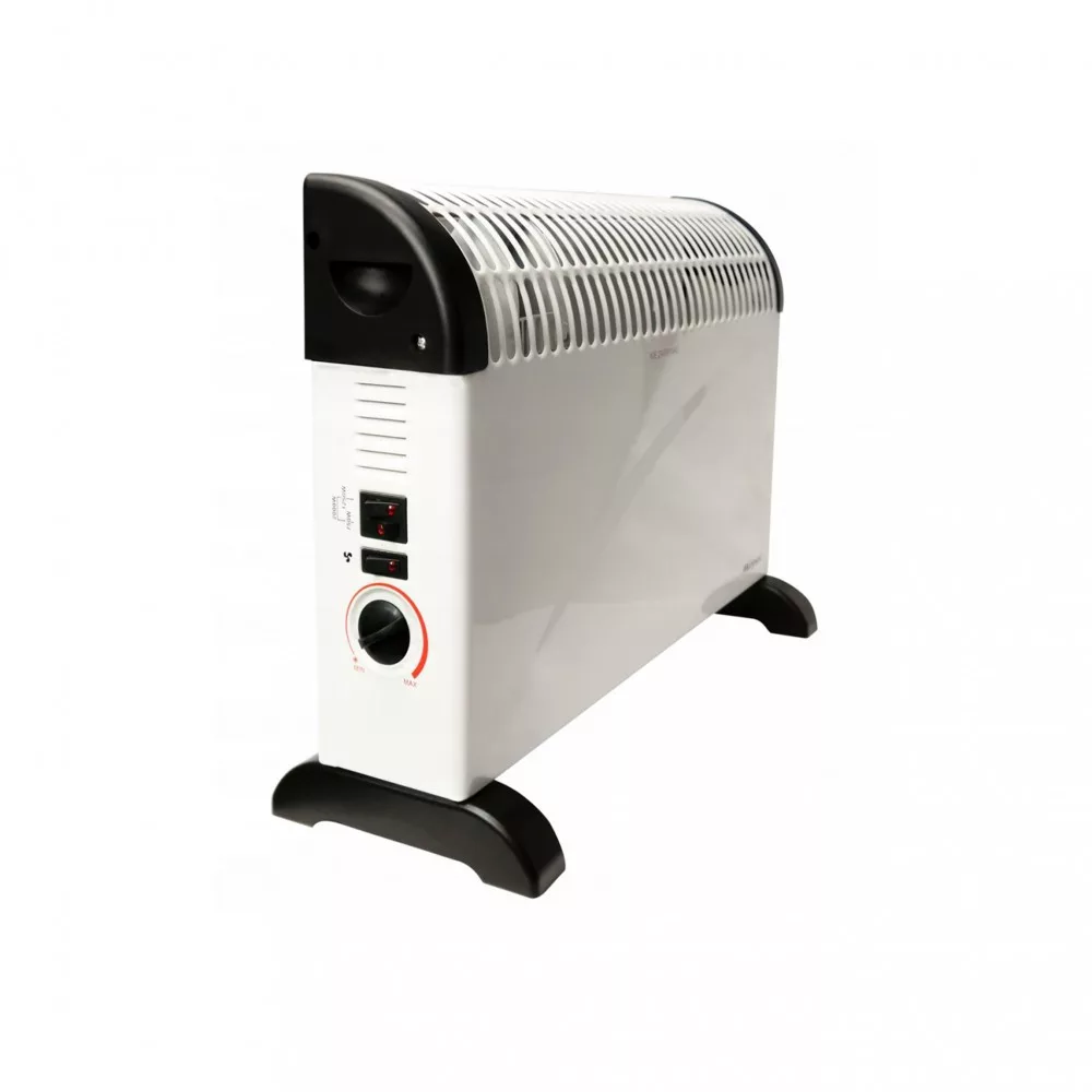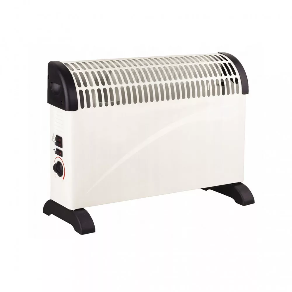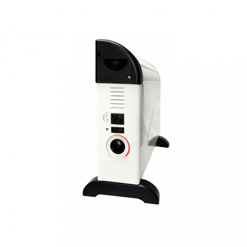 Wydajny grzejnik elektryczny posiada ręcznie regulowany termostat, dzięki któremu moc grzewczą można regulować na 3 poziomach (750W / 1250W / 2000W).
