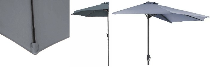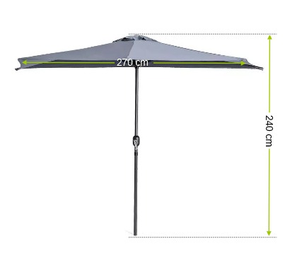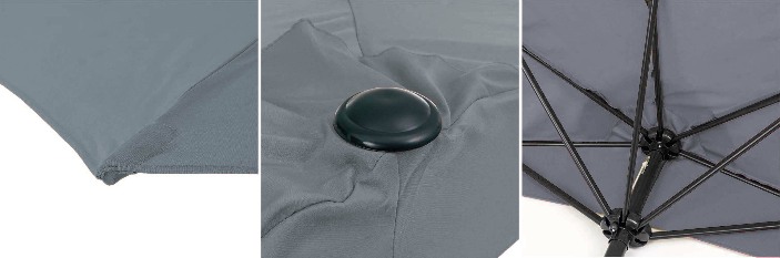 Słupy dużego parasola ogrodowego wykonane są ze stali. Parasol ma półokrągły kształt, co pozwala na zacienienie niewielkich przestrzeni. Półokrągły parasol wzmocniony 5-żebrową konstrukcją pozwala na ustawienie parasola przy ścianie. Do wykonania parasola użyto poliestru. Dzięki zastosowanym materiałom duży parasol jest wytrzymały i łatwy w obsłudze, co ma znaczący wpływ na czas użytkowania.