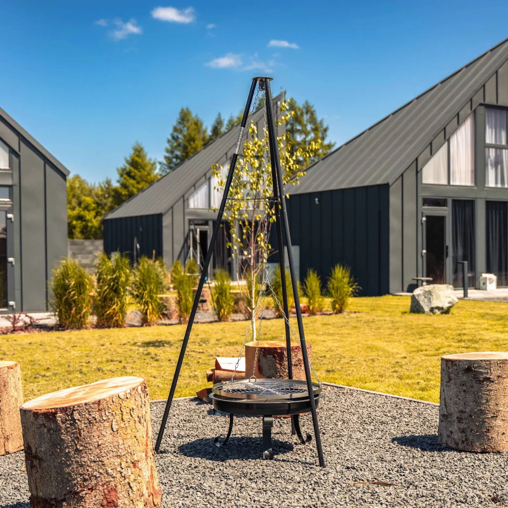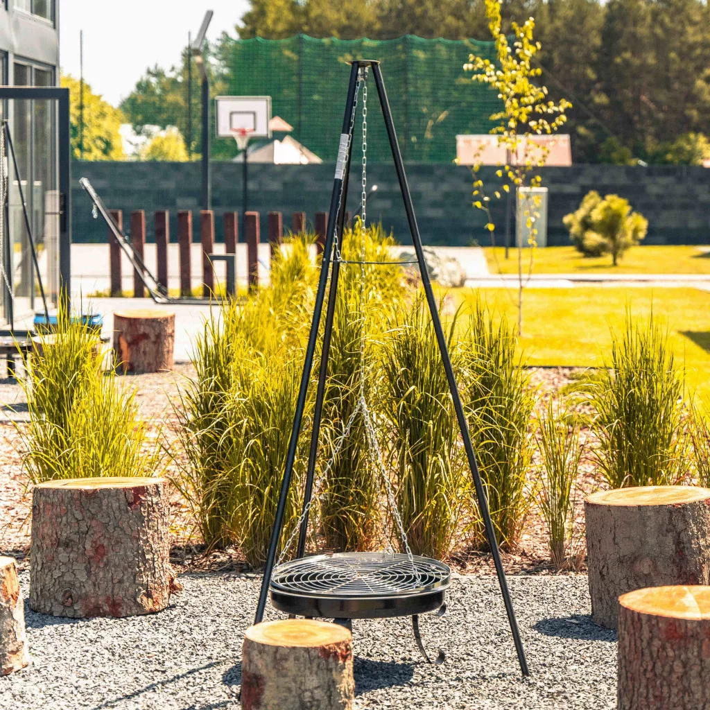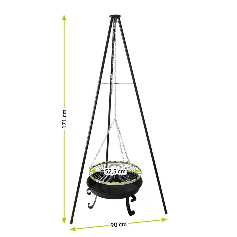 Łatwa regulacja wysokości zawieszonego rusztu grilla na trójnoguumożliwia ustawienie żądanej temperatury i serwowanie różnorodnych potraw. Naczynie do pieczenia jest oddzielnym elementem, dzięki czemu palenisko ogrodowe może być wykorzystywane do dwóch celów. Samodzielny grill może być używany jako ruszt nad przygotowanym ogniskiem, a także w brytfannie bez konieczności przygotowywania osobnego miejsca.