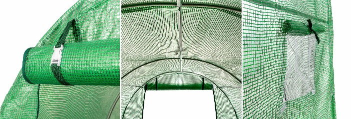 Nowoczesne tunele foliowe posiadają drzwi na zawiasach, co znacznie zwiększa wygodę użytkowania. Jego zaletą jest 6 otworów z siatką i rolowanymi zamknięciami, które zapewniają cyrkulację powietrza, jednocześnie chroniąc przed niechcianymi owadami. Okienka po obu stronach pozwalają na odpowiedni dostęp wilgoci i przenikanie większości światła, znacząco wpływając na wzrost plonów. Folia szklarniowa umożliwia uprawę niezależnie od pogody i pory roku. Doskonały wybór, jeśli chcesz uprawiać własne warzywa lub owoce.