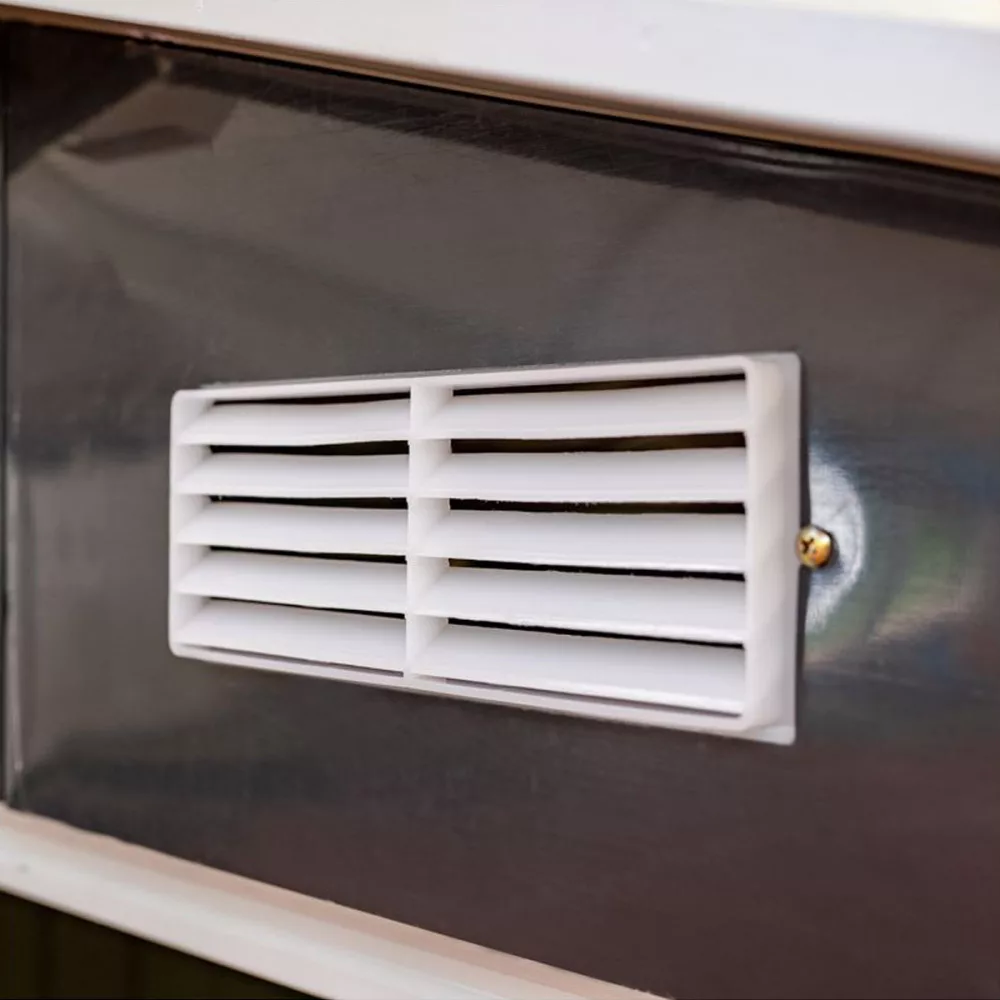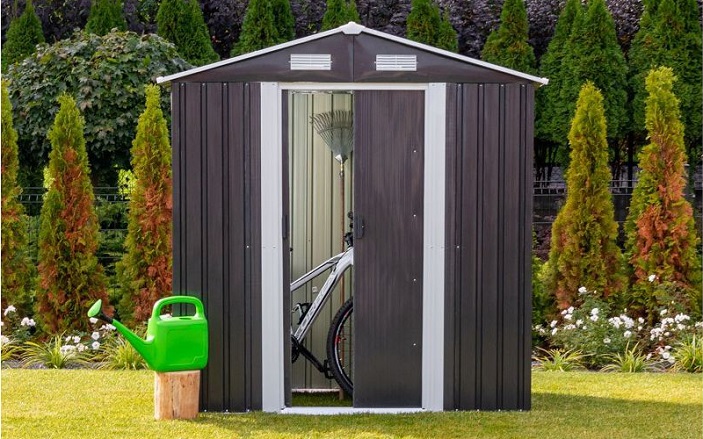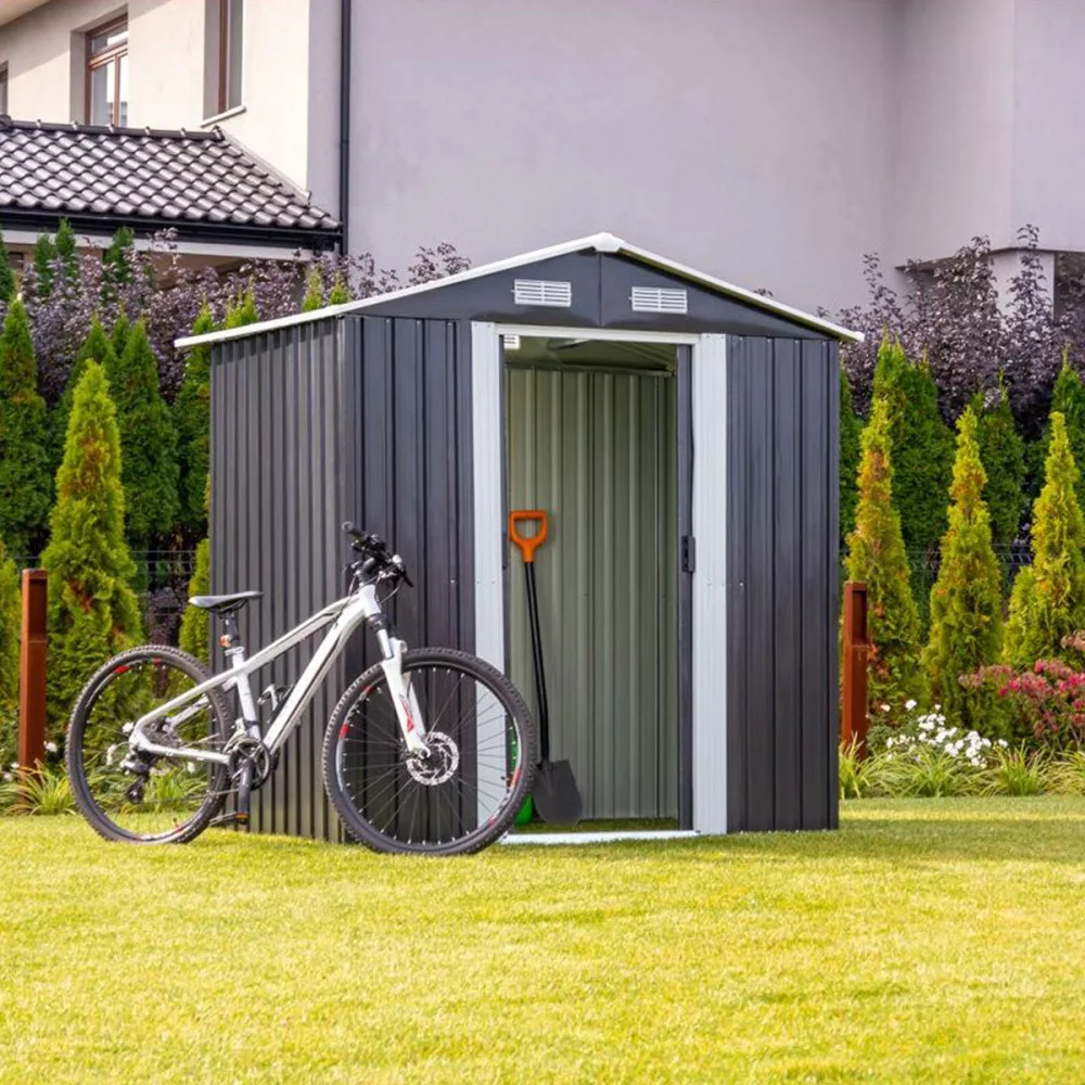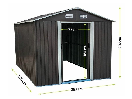 A fém szerszámház tolóajtóval rendelkezik , ennek köszönhetően nem sok helyet foglal. A kerti ház előnye az elülső fal felső részén elhelyezett szellőzőnyílások .