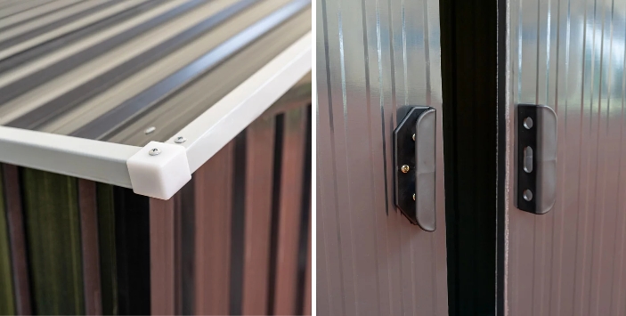 A szerszámtároló szerkezete horganyzott acélból készül, ami ellenállóvá teszi a korrózióval szemben. Horganyzott acélfalak biztosítják a kerti ház szilárdságát.