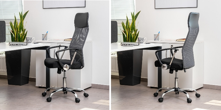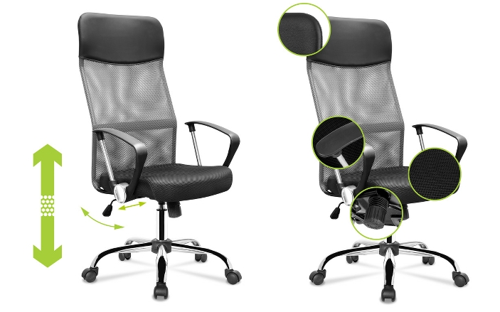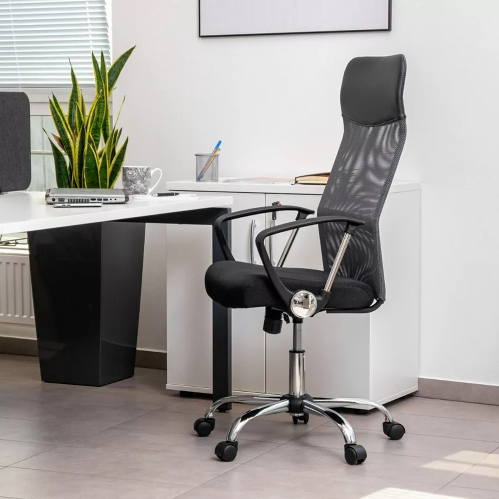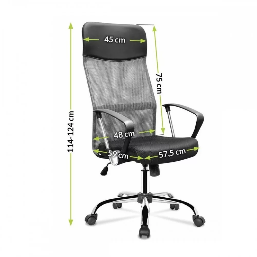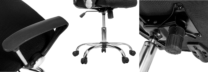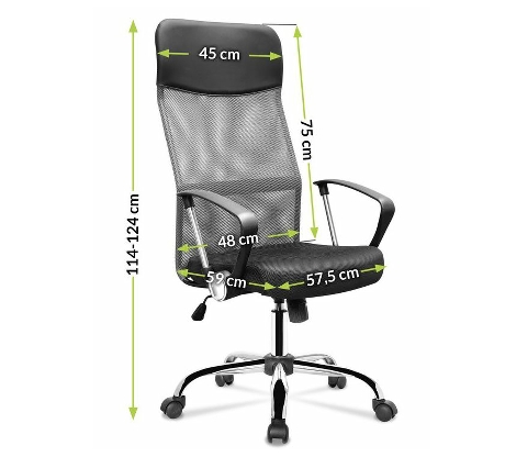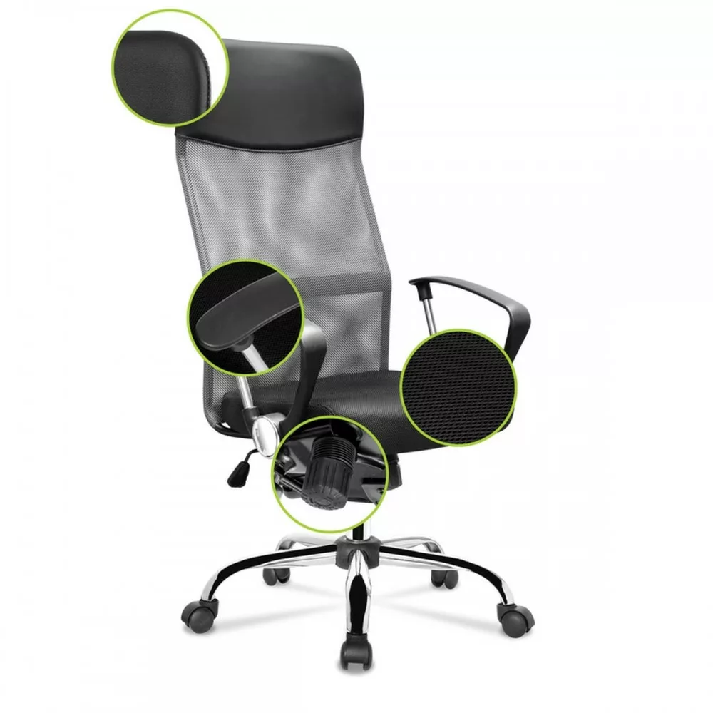 Krzesło obrotowe posiada ergonomicznie zaprojektowane oparcie, które zapewnia idealne podparcie dla kręgosłupa oraz wbudowany wysoki zagłówek zapewniający komfort podczas użytkowania. Wbudowane podłokietniki zwiększają stabilizację ciała i zapewniają odciążenie ramion i barków. Siedzisko obrotowego fotela biurowego wykonanejest z wysokiej jakości siatki , której główną zaletą jest zapewnienie przepływu powietrza pomiędzy plecami a oparciem. Materiał siedziska jest bardzo wytrzymały, a krzesło jest łatwe w czyszczeniu. Kolejną zaletą jest podnośnik gazowy, który umożliwia dostosowanie wysokości siedziska do użytkownika.