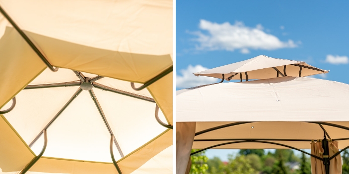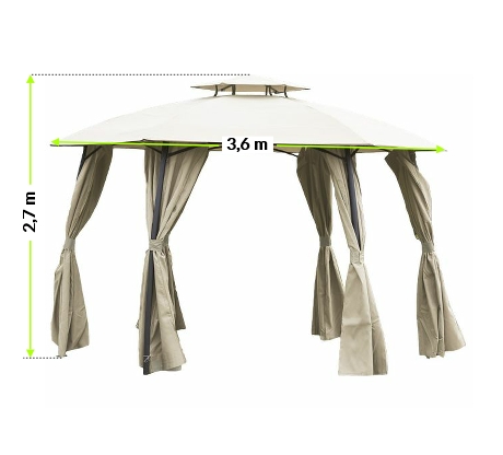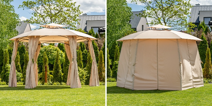 Altana ogrodowa wyposażona jest w przesuwne ściany boczne, które umożliwiają jej otwieranie lub zamykanie w zależności od indywidualnych potrzeb. Zaletą altany ogrodowej jest dwustopniowy dach, który zapewnia cyrkulację powietrza wewnątrz namiotu ogrodowego.