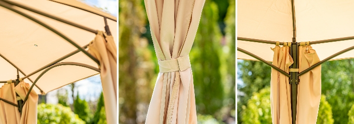 Solidna konstrukcja została wzmocniona stalowymi belkami, co zwiększa stabilność pawilonu ogrodowego. Dach wykonano z poliestru 180g z dodatkową warstwą PA, natomiast ściany boczne z poliestru 160g. Dzięki zastosowanym materiałom altanaogrodowa sprawdza się przez kilka sezonów.