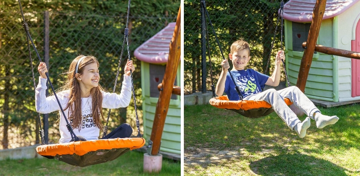 Wytrzymałe liny mają regulowaną długość, co pozwala na dostosowanie wysokości do wzrostu i wieku użytkownika. Zaprojektowana z myślą o dzieciach konstrukcja ramy huśtawki posiada piankową osłonę, która zmniejsza ryzyko kolizji podczas zabawy. Dodatkową ochronę zapewnia osłona na połączeniach między linami a konstrukcją siedziska, co jeszcze bardziej zwiększa poziom bezpieczeństwa dziecka. Huśtawka ogrodowa posiada siedzisko wykonane z czarnej wykładziny PP, która jest wysoce odporna na zabrudzenia i uszkodzenia. Huśtawki gniazdowe wyglądają świetnie w każdym otoczeniu. Dzięki zastosowanym materiałom konserwacja huśtawki hamakowej jest bezproblemowa.