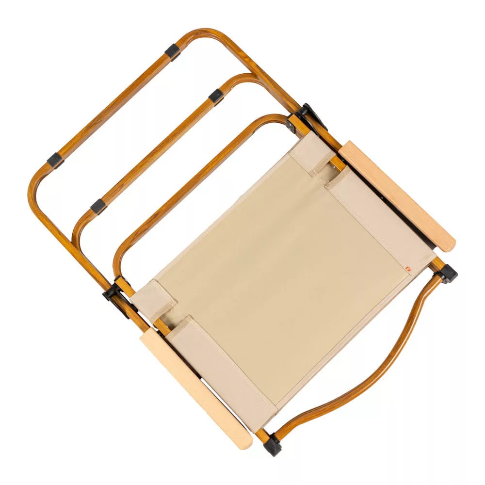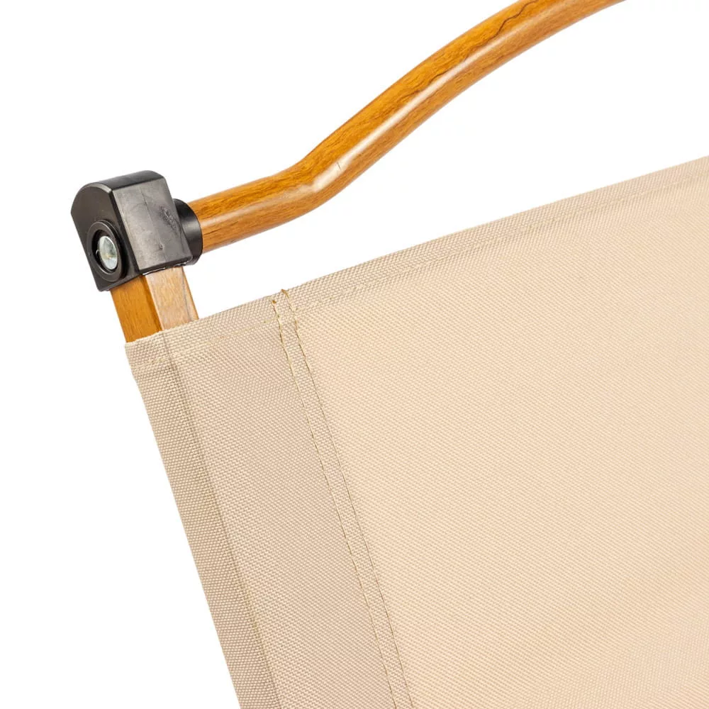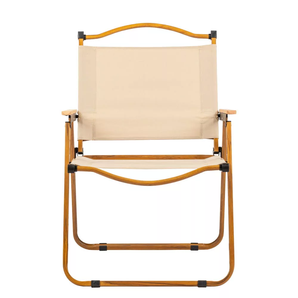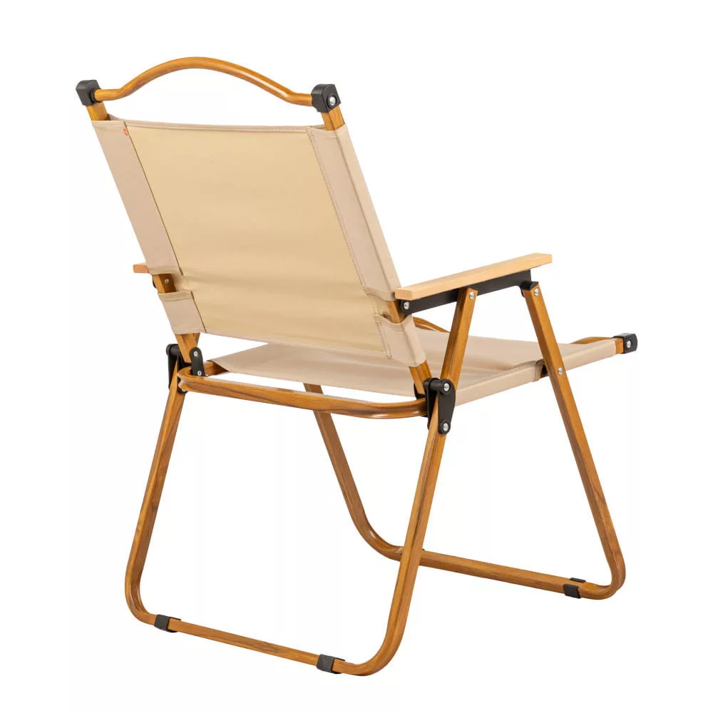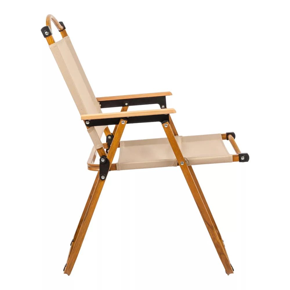 Wygodne krzesło kempingowe łączy w sobie funkcjonalność i elegancję. Krzesło z wyższym oparciem zapewnia komfort wypoczynku na świeżym powietrzu. Rama wykonana jest ze stali pokrytej lakierem imitującym drewno, co gwarantuje niezawodność i wytrzymałość konstrukcji. Drewniane podłokietniki dodają dodatkowego uroku, jednocześnie podkreślając trwałość.
