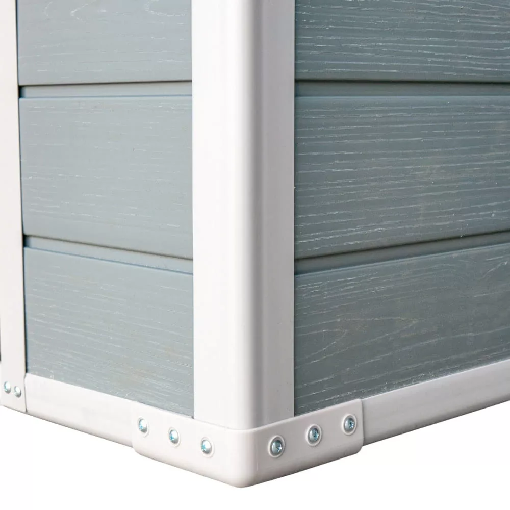 Szopa na narzędzia ma wytrzymałą konstrukcję z polipropylenu, która doskonale sprawdzi się w każdym ogrodzie. Solidne podwójne ściany zapewniają optymalną izolację i ochronę przed uszkodzeniami mechanicznymi. Rama z ocynkowanej stali o grubości 0,6 mm zwiększa stabilność i odporność na korozję, dzięki czemu obudowa jest trwała i niezawodna.