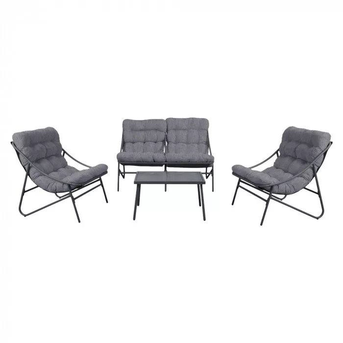 Zestaw wypoczynkowy Vibe to stylowa propozycja, która idealnie wpasuje się w aranżację ogrodu lub patio. Składa się z 4 elementów: dwóch wygodnych foteli, sofy i stolika kawowego, które pozwolą stworzyć przyjemną strefę relaksu na świeżym powietrzu. Meble ogrodowe wykonane są z malowanej proszkowo stali galwanizowanej, trwałej i odpornej na warunki atmosferyczne.