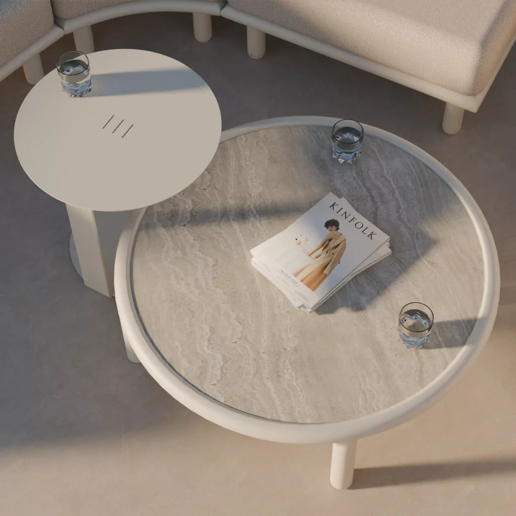 Centralnym punktem zestawu jest stolik kawowy ze spieku kamiennego - materiału, który łączy w sobie lekkość z wyjątkową trwałością. Blat jest odporny na wilgoć, plamy i uszkodzenia oraz ma nowoczesny wygląd. Malowana proszkowo aluminiowa rama zapewnia stabilność i wygodę, dzięki czemu stolik idealnie nadaje się zarówno do codziennego relaksu, jak i większych spotkań.