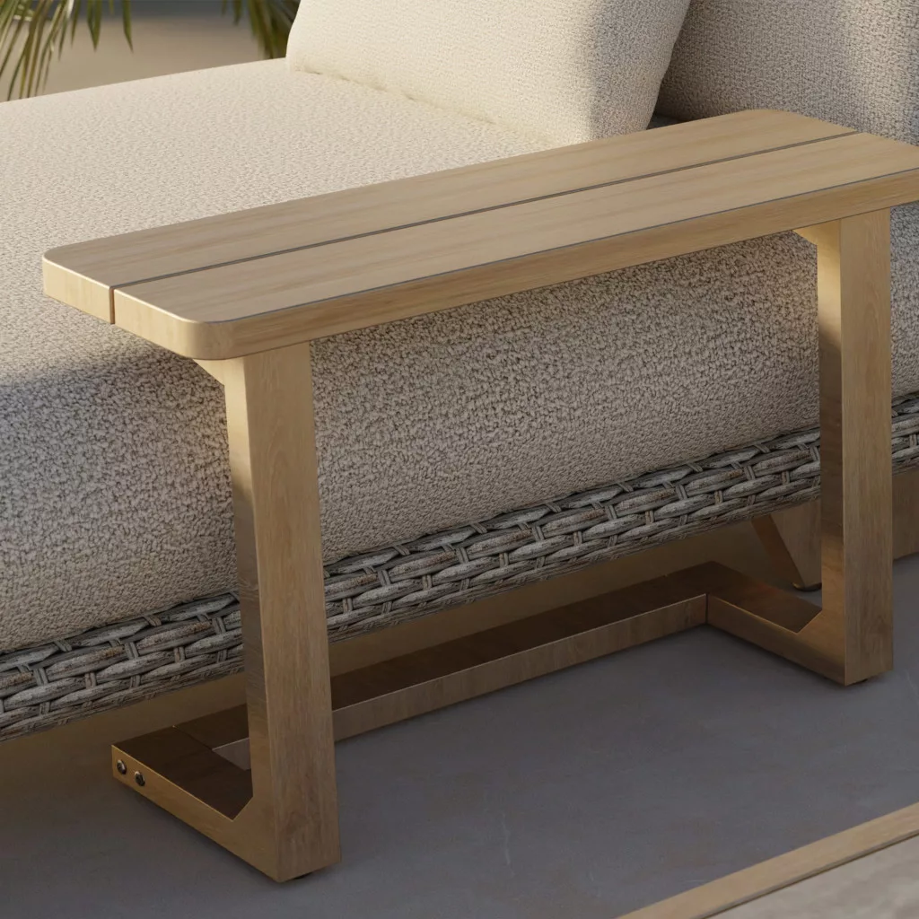 Centralnym elementem zestawu jest stół wykonany z innowacyjnego materiału Mayo Board. Lżejszy niż spiekany kamień, a jednocześnie niezwykle odporny na uderzenia, zarysowania i warunki atmosferyczne. Jest odporny na blaknięcie w świetle słonecznym, nie wchłania wilgoci i zachowuje swoją strukturę pomimo intensywnego użytkowania. Zestaw zawiera również lekki aluminiowy stolik boczny, który można umieścić w dowolnym miejscu - idealny na kawę, książki lub dekoracje.