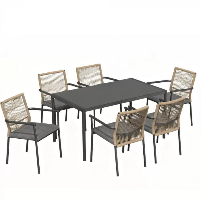 Zestaw jadalniany VENCE składa się ze stołu i sześciu foteli, zaprojektowanych do użytku w ogrodach, na tarasach i dziedzińcach. Jego klasyczny kształt i funkcjonalny układ zapewniają wygodne użytkowanie zarówno w przestrzeniach prywatnych, jak i komercyjnych.